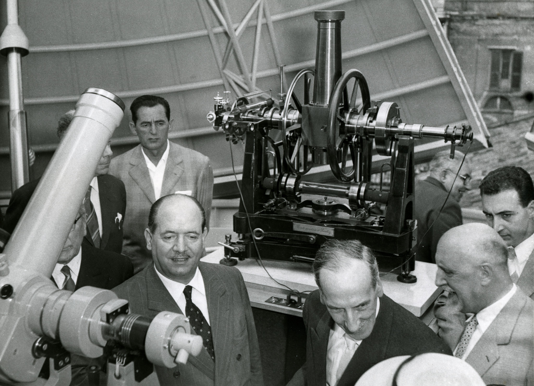 Cerimonia di inaugurazione della cupola a fiore nel 1957. In primo piano Francesco Zagar, direttore dell'Osservatorio, con a lato (a sinistra) l'onorevole Giuseppe Togni, ministro dei Lavori Pubblici; all'estrema destra Edoardo Proverbio.