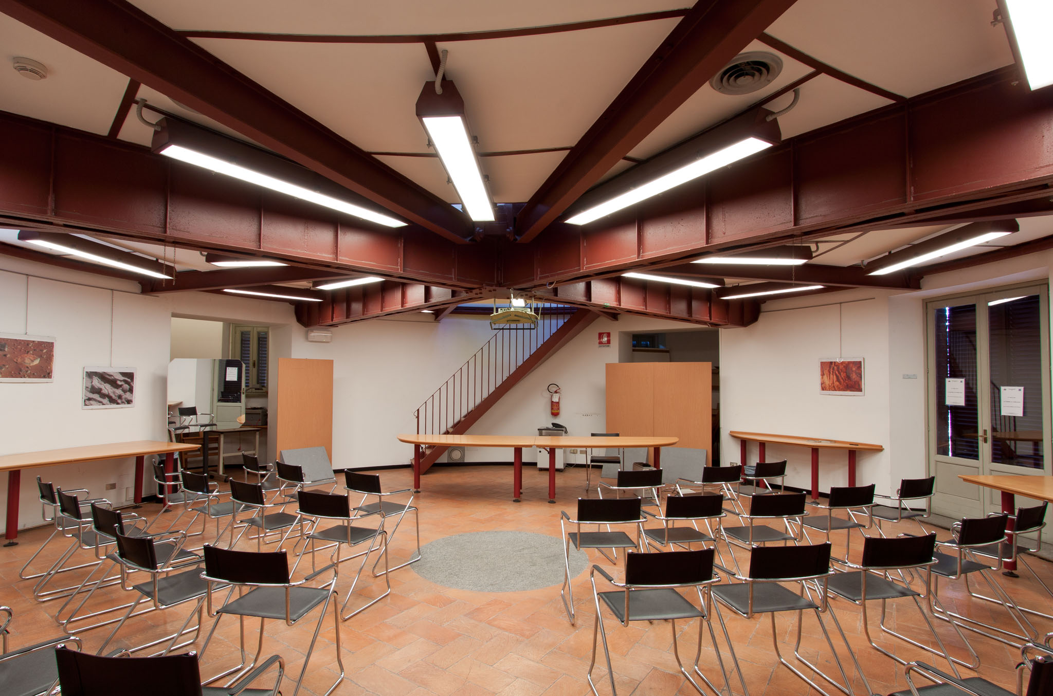 Il piano inferiore della cupola a fiore. L'edificio fu eretto sfruttando i muri portanti della cupola del Merz-Repsold, costruendo a metà della loro altezza un soppalco sostenuto da putrelle di ferro (visibili nella parte superiore della fotografia) per ricavare un piano rialzato su cui installare gli strumenti dei passaggi (molto più piccoli del precedente rifrattore).