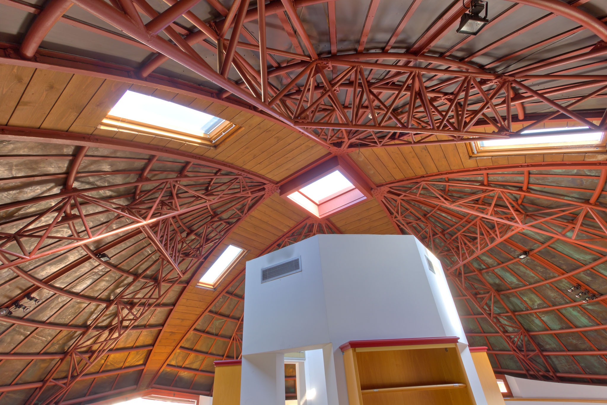 Anche al piano superiore della cupola a fiore, dove fino al 1970 erano installati gli strumenti dei passaggi, l'architetto ha conservato il più possibile la struttura originaria, mantenendo le placche triangolari di copertura, bloccate in posizione semiaperta da inserti di metallo rivestiti internamente di legno e dotati di lucernari (fotografia del giugno 2010).