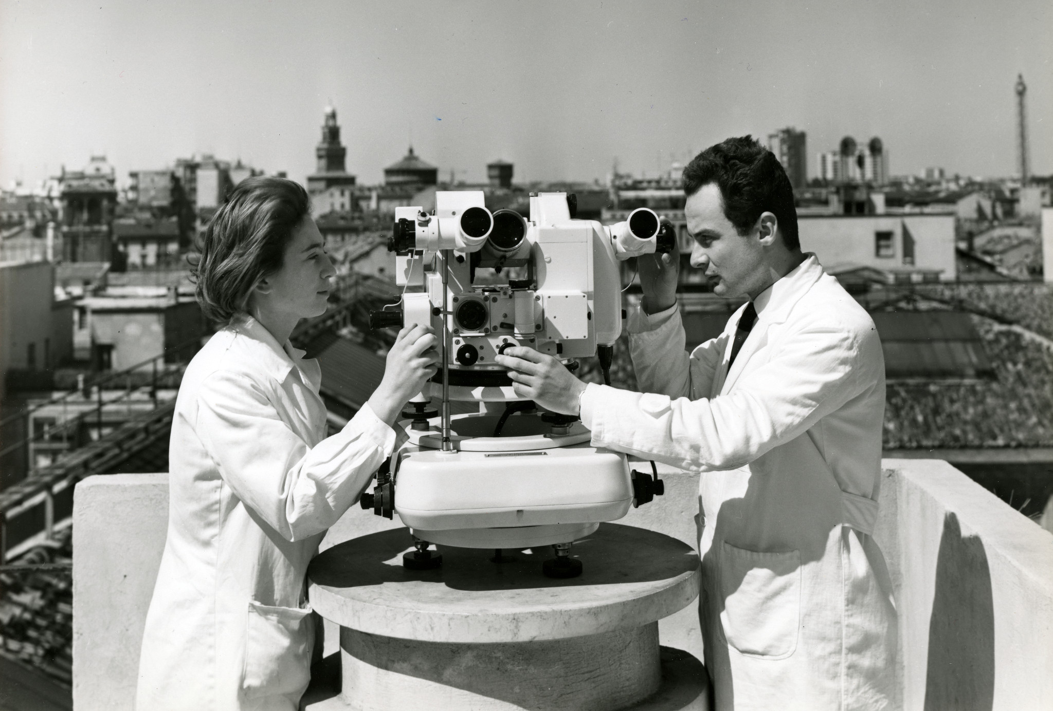Letizia Buffoni (a sinistra) e Alessandro Manara (a destra) manovrano il teodolite TPR Gigas, della ditta Askania di Berlino. Si tratta di uno strumento dotato di un sistema di puntamento motorizzato che veniva usato per misurare le posizioni di satelliti artificiali al fine di calcolarne l'orbita. Lo strumento fu acquistato nel 1965, sulla scia degli studi di geodinamica e fisica terrestre inaugurati dalla partecipazione dell'Osservatorio di Brera all'Anno Geofisico Internazionale (1957).