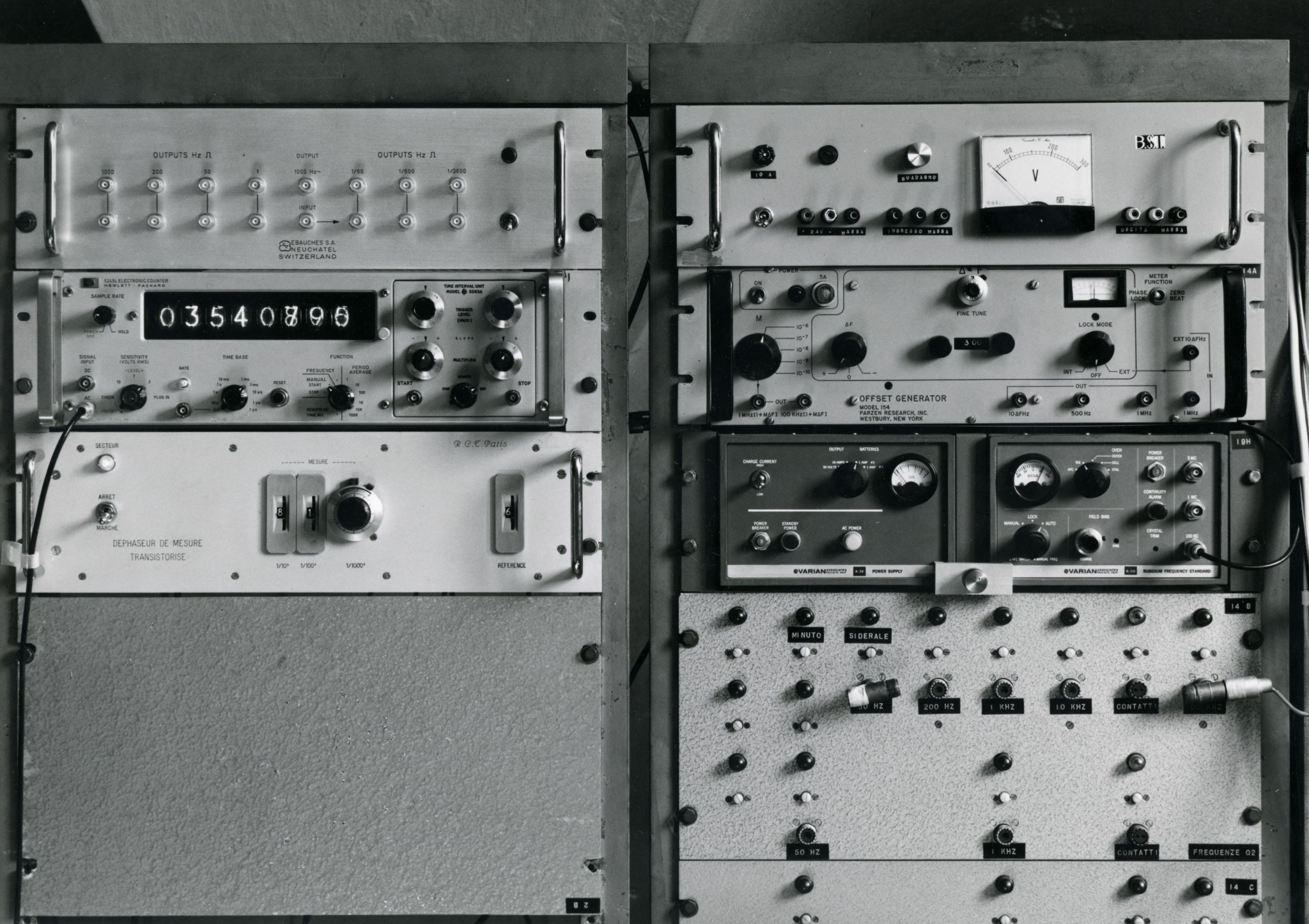 Un orologio atomico (al rubidio) e gli apparecchi elettronici collegati, che facevano parte della strumentazione dedicata allo studio del tempo e della rotazione terrestre (fotografia del 1970 circa).