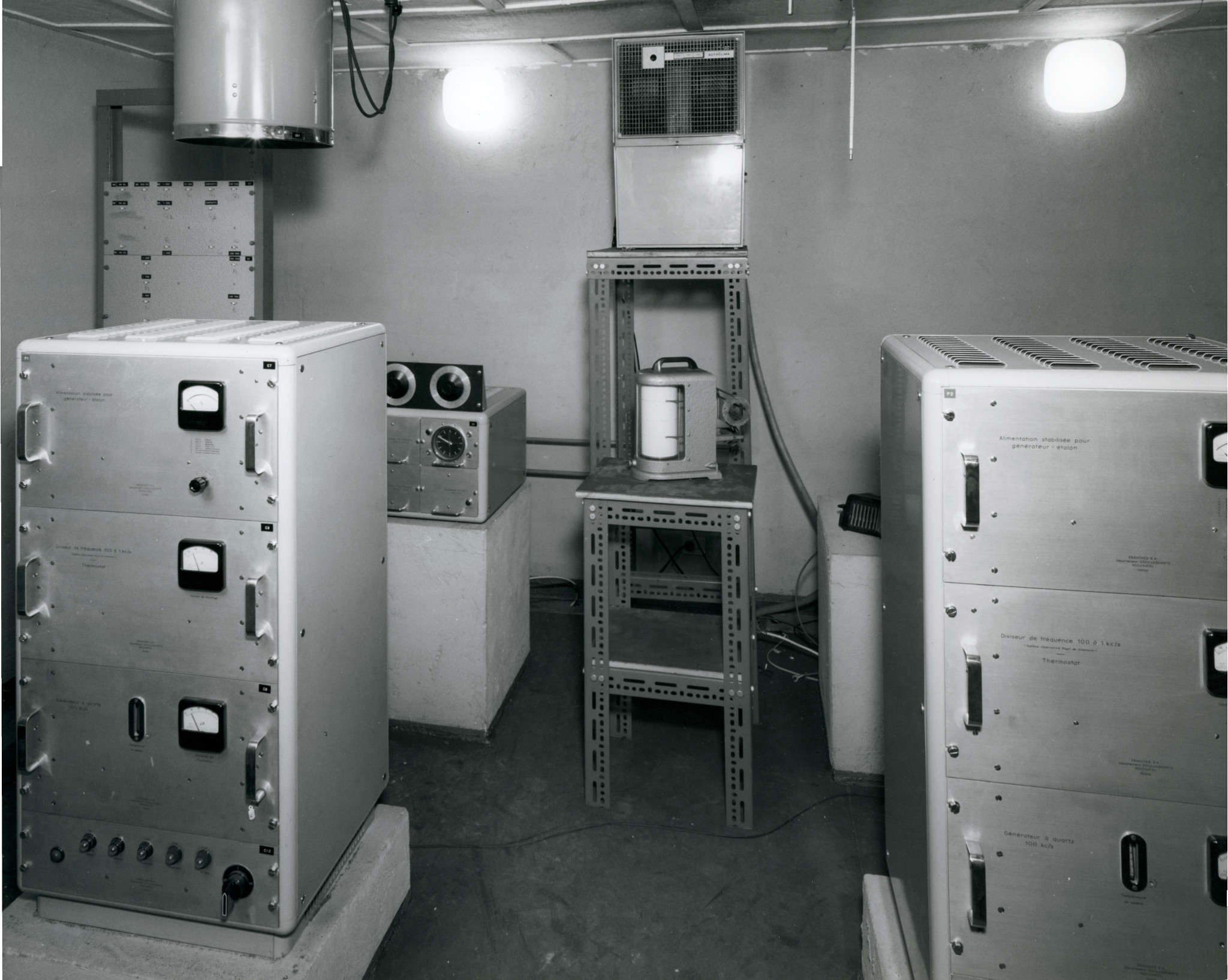 Due campioni di frequenza al quarzo, installati in una camera termostatata, che facevano parte della strumentazione dedicata allo studio del tempo e della rotazione terrestre (fotografia del 1970 circa).