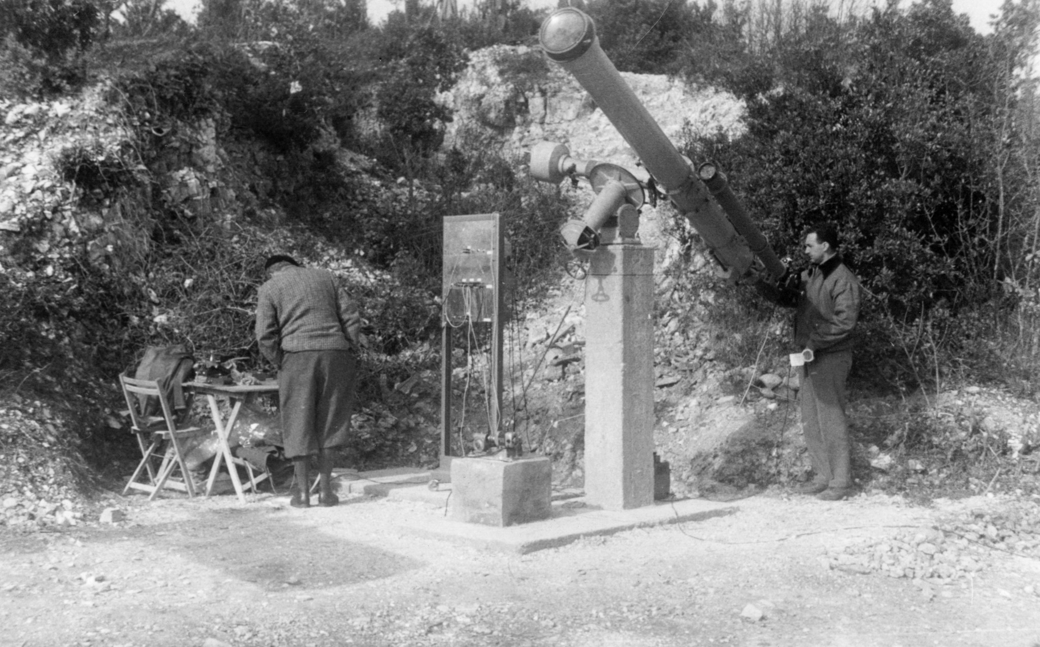 Il rifrattore Merz-Salmoiraghi installato in una postazione provvisoria sul Monte Conero (Ancona) per osservare l'eclissi totale di Sole del 15 febbraio 1961. Fu una delle ultime occasioni in cui lo strumento, ormai obsoleto, è stato usato per una finalità scientifica, prima di essere messo in pensione. La persona alla destra dello strumento è Edoardo Proverbio.