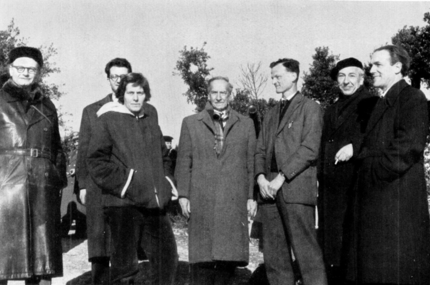 Foto di gruppo di alcuni dei partecipanti alla spedizione per osservare l'eclissi totale di Sole del 15 febbraio 1961 al Monte Conero. Si riconoscono: Margherita Hack (terza da sinistra), Francesco Zagar (al centro), Alberto Masani (all'estrema destra).