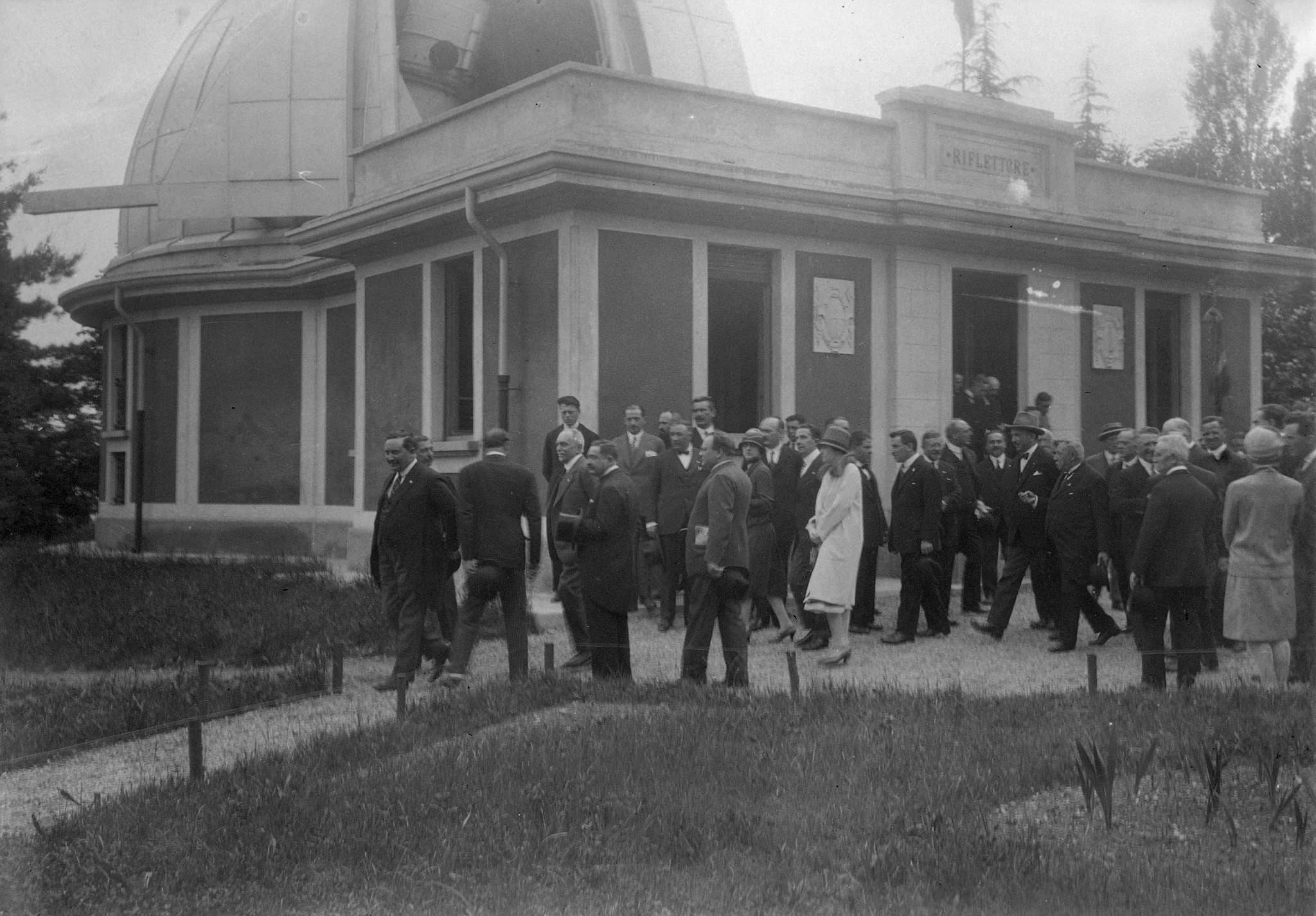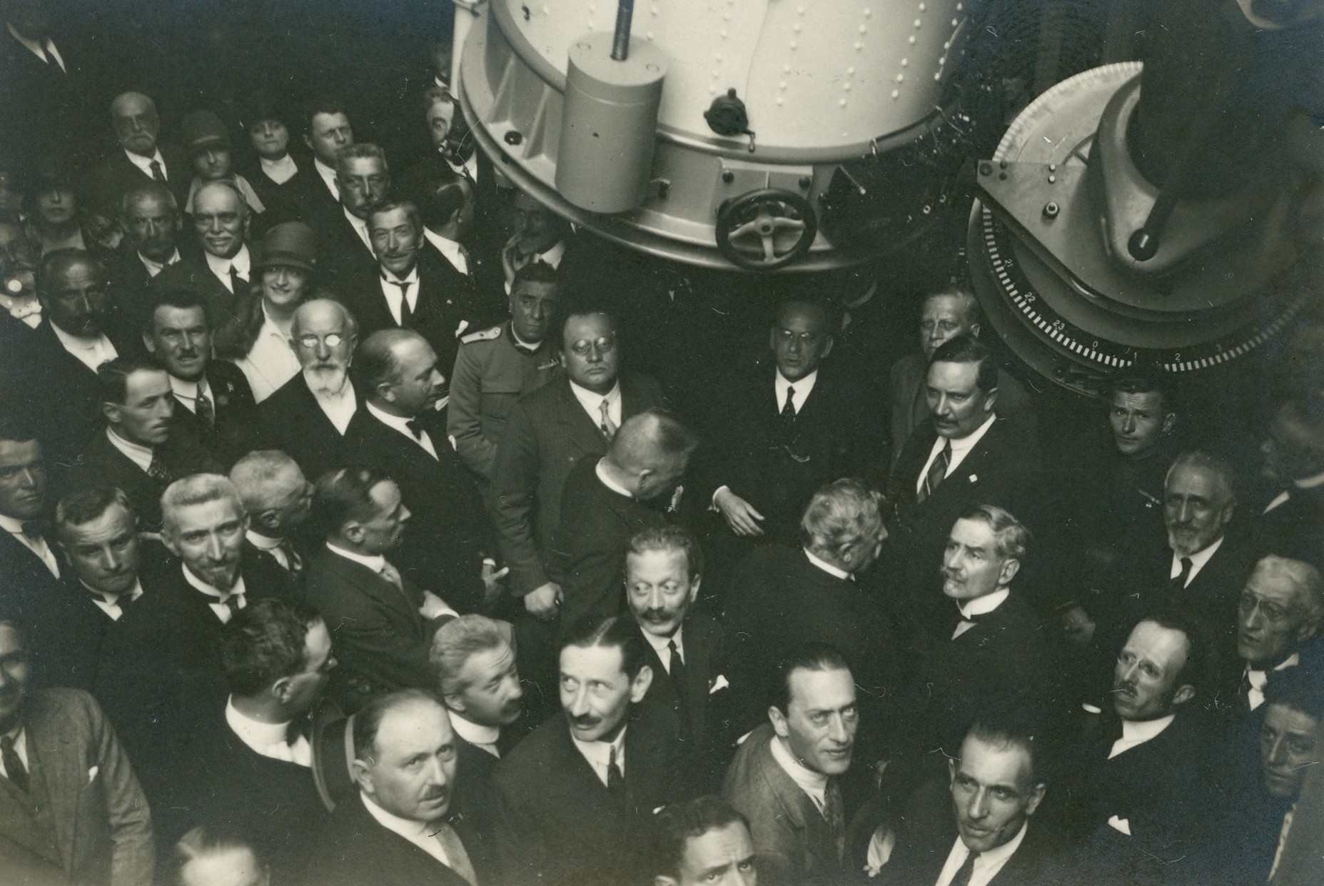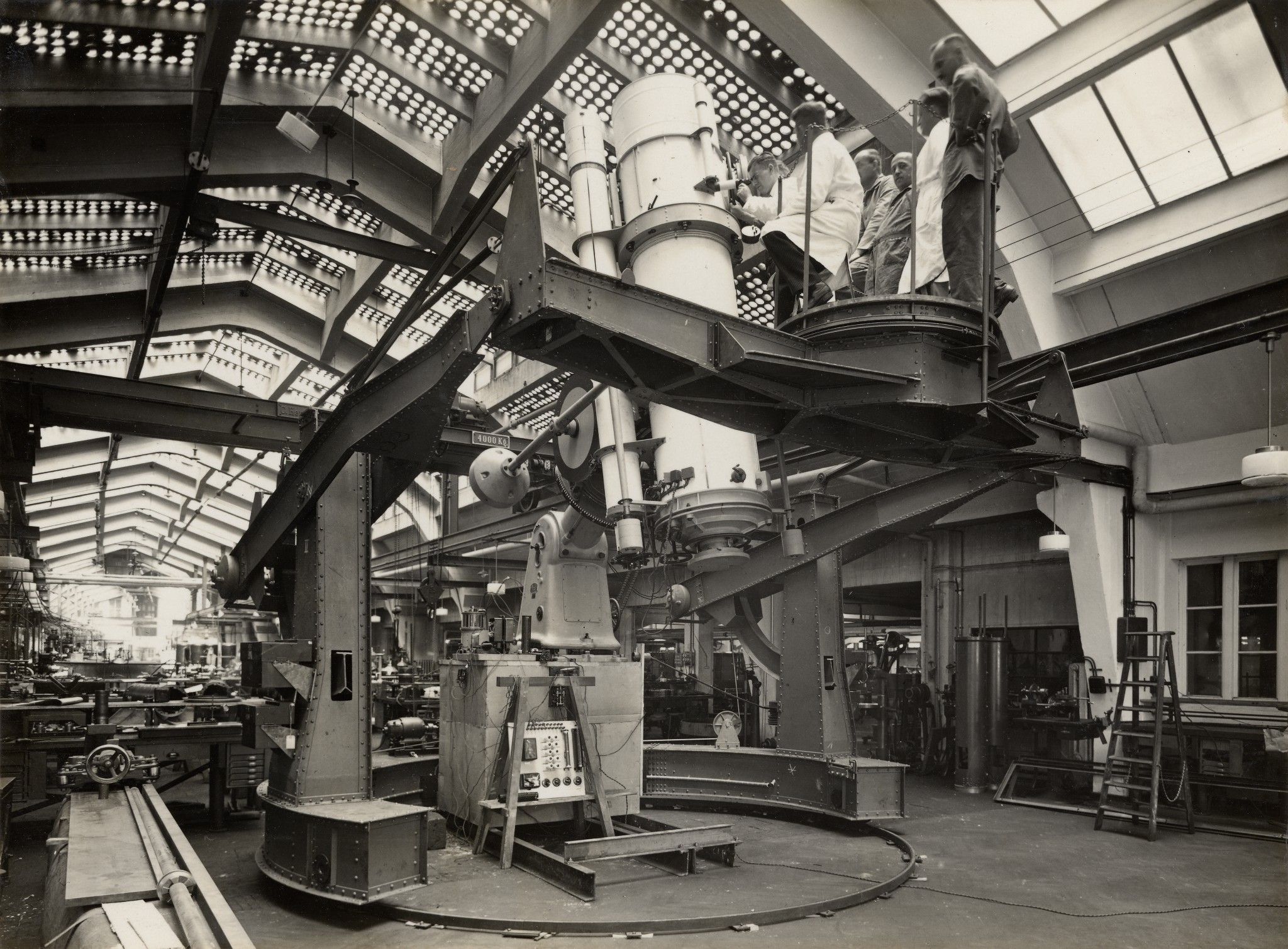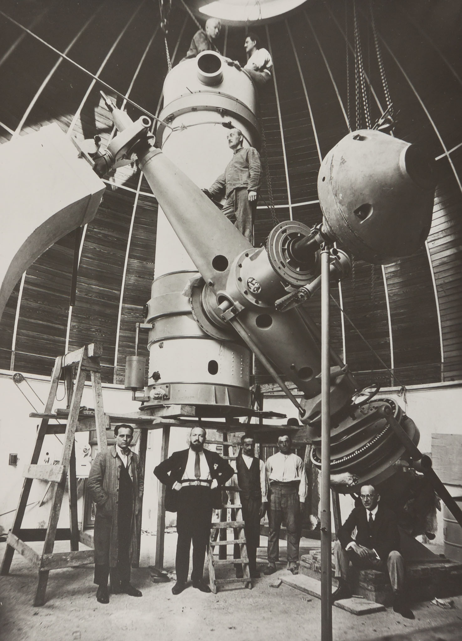 Una fase del montaggio del riflettore Zeiss a Merate (27 luglio 1926); all'estrema sinistra si vede Emilio Bianchi, direttore dell'Osservatorio.