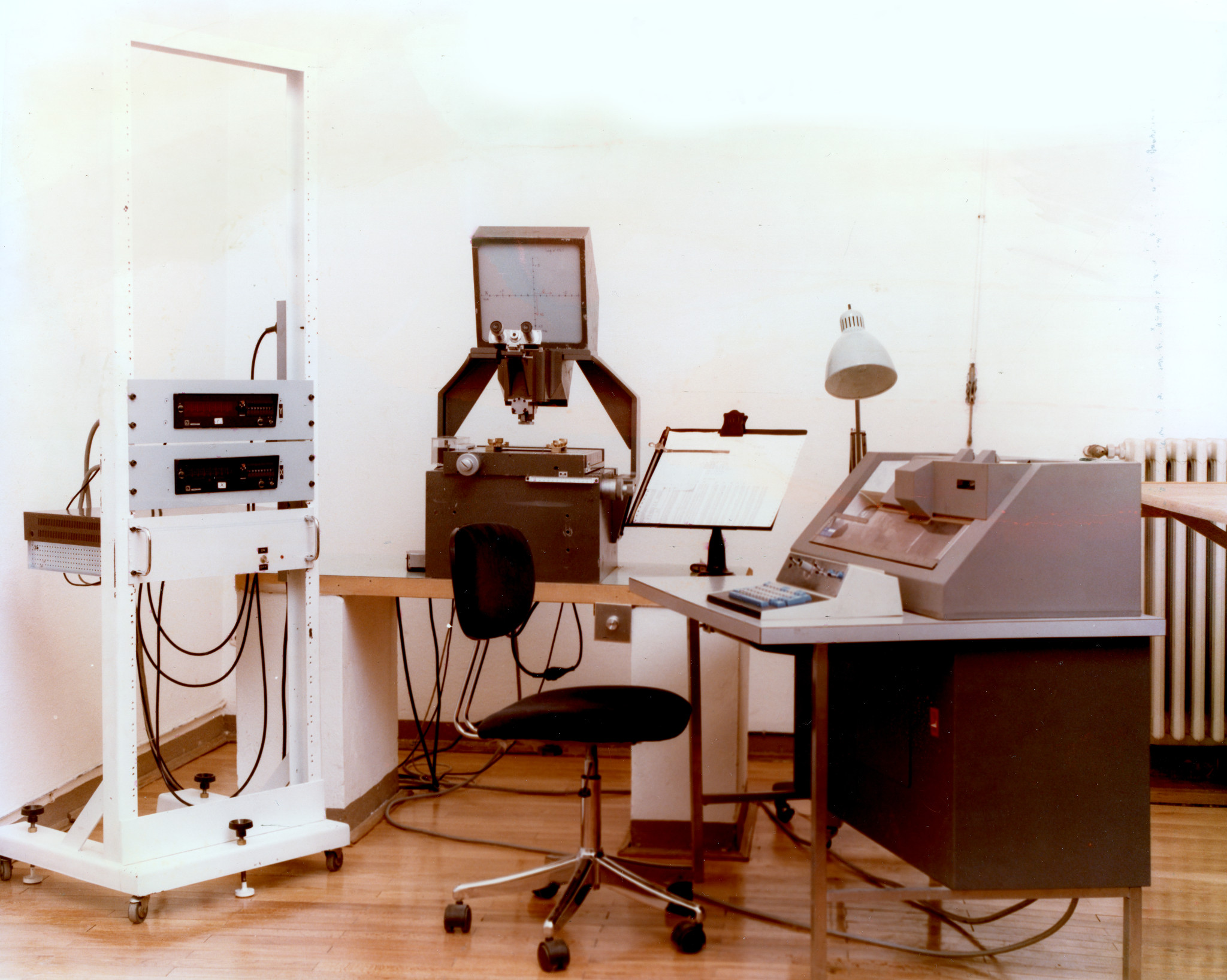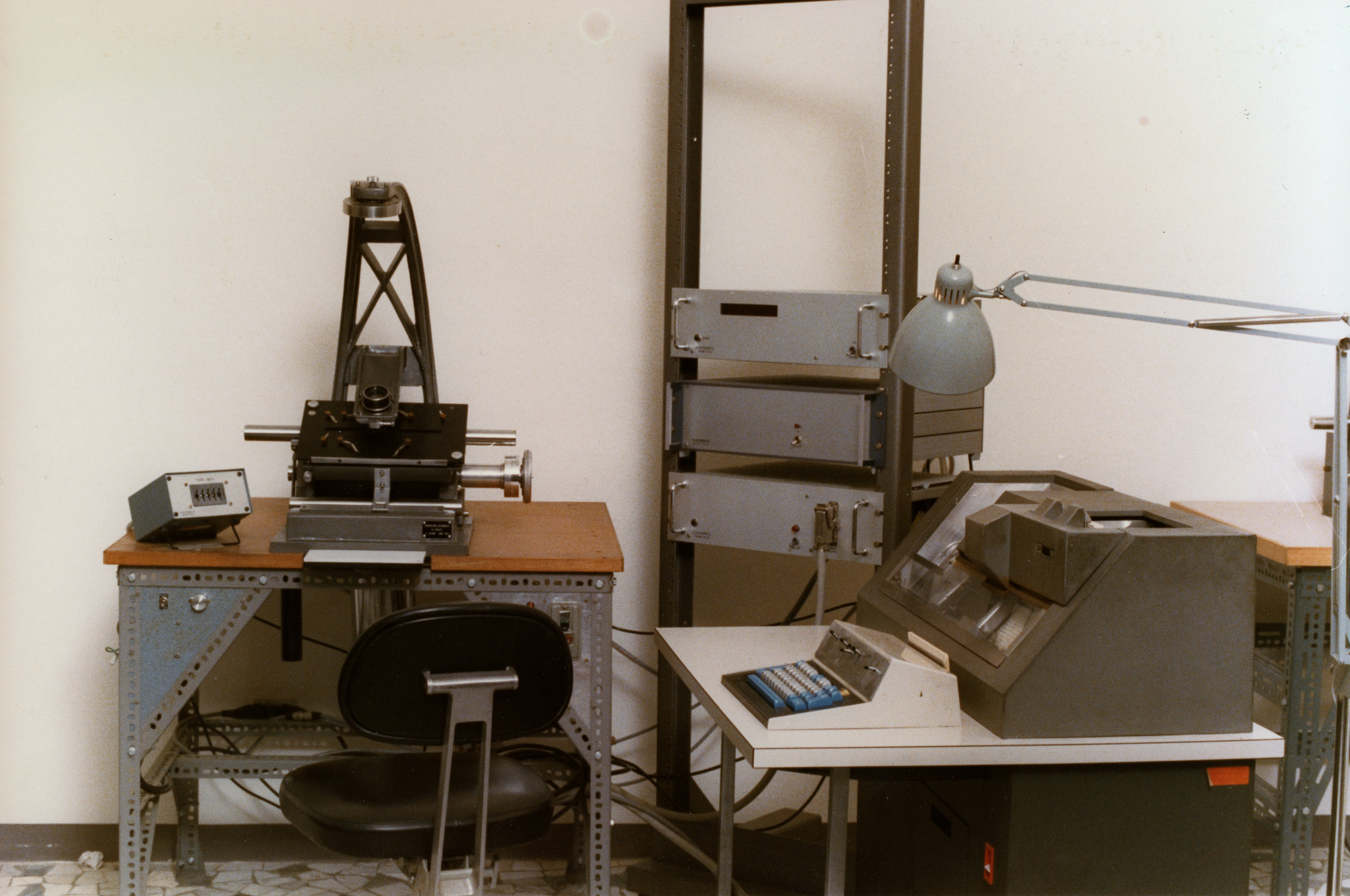 Misuratore digitale di spettri da lastre fotografiche (a sinistra); a destra è visibile un perforatore di schede.