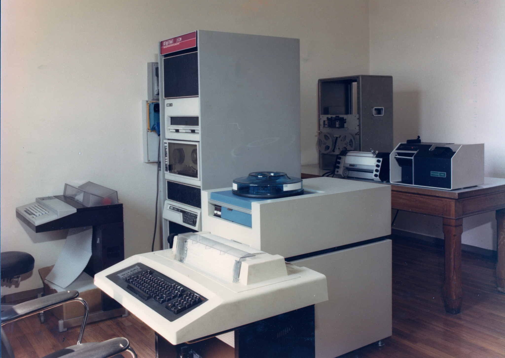 Calcolatore Digital PDP11/34 con periferiche (terminali scriventi, unità a nastro magnetico, unità a disco, plotter, lettore di schede perforate).