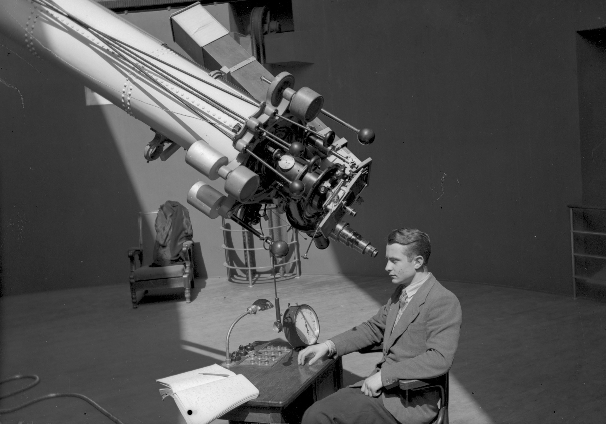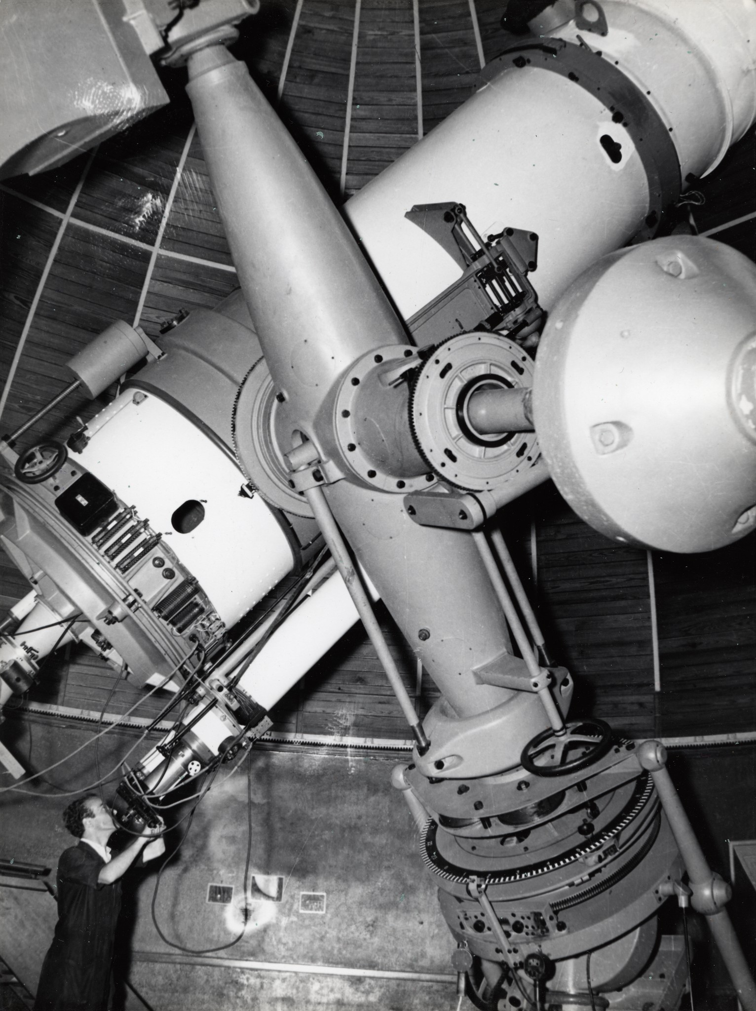 Mario Cavedon osserva al rifrattore Merz-Repsold a Merate.