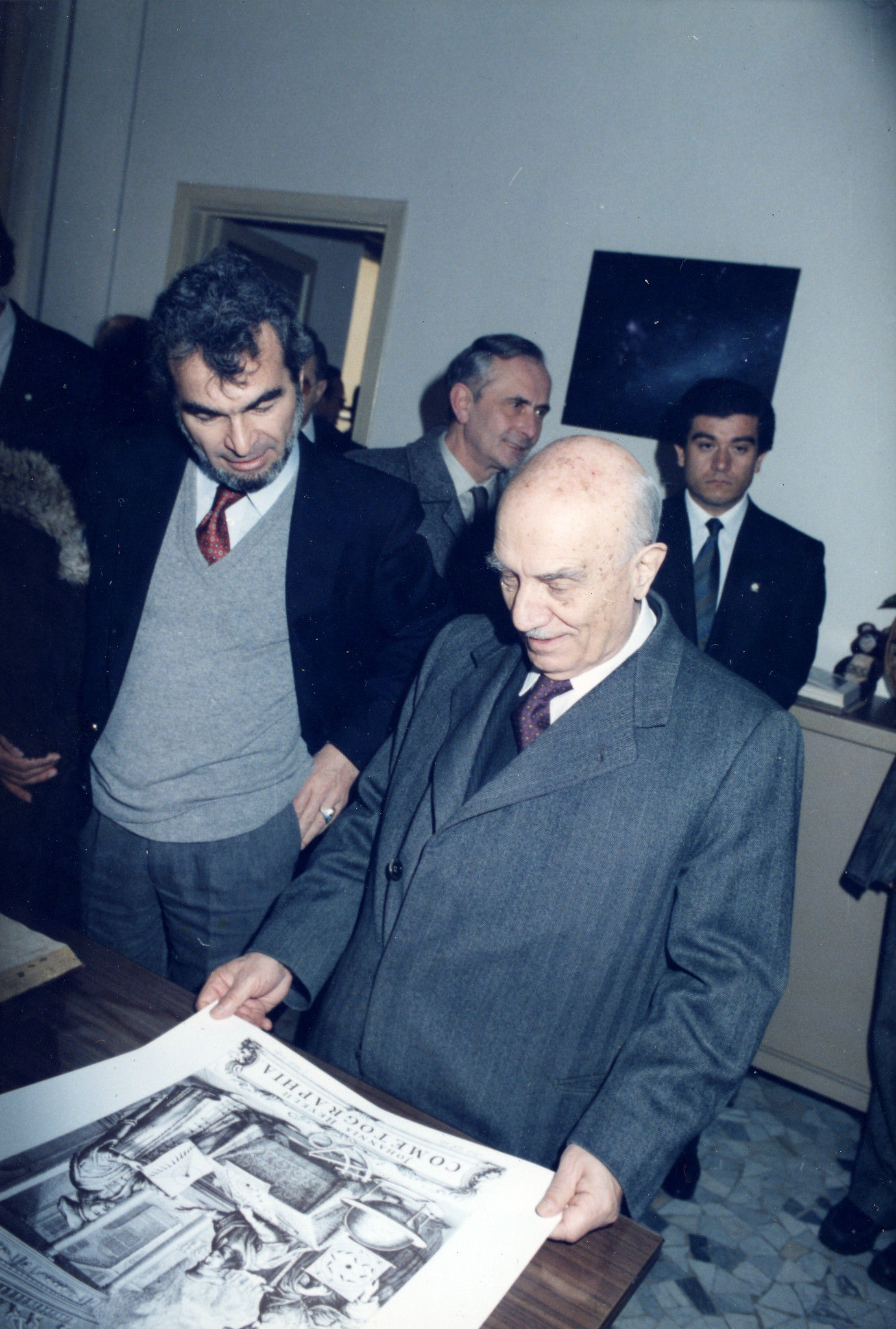 Il senatore Amintore Fanfani, allora presidente del Senato, visita l'Osservatorio a Merate (15 marzo 1986), accolto da Guido Chincarini (a sinistra), direttore dell'Osservatorio dal 1985 al 2001. Sullo sfondo, al centro, Pietro Broglia.