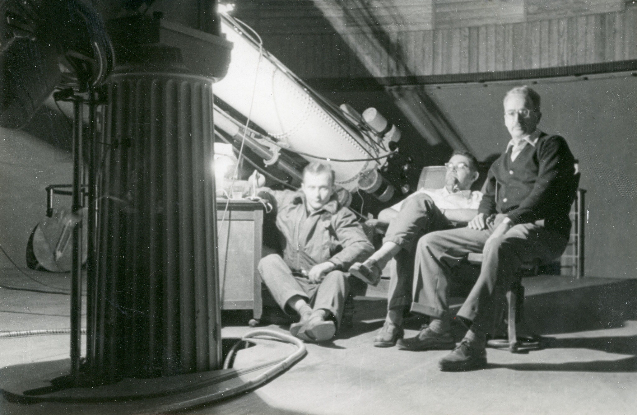 Pietro Broglia (a sinistra), Aldo Kranjc (al centro) e l'ing. Glauco de Mottoni di fianco al rifrattore Merz-Repsold nella sua cupola a Merate.