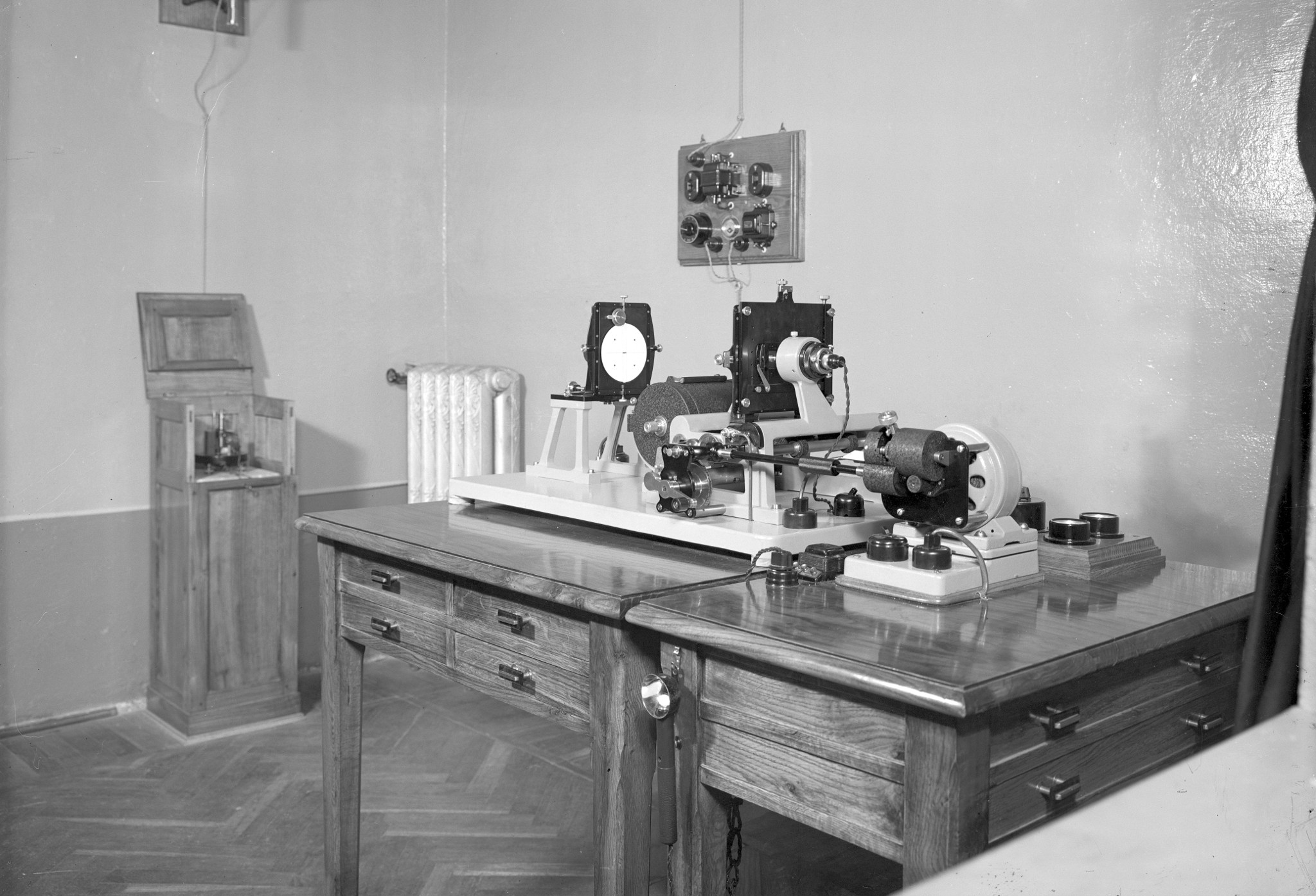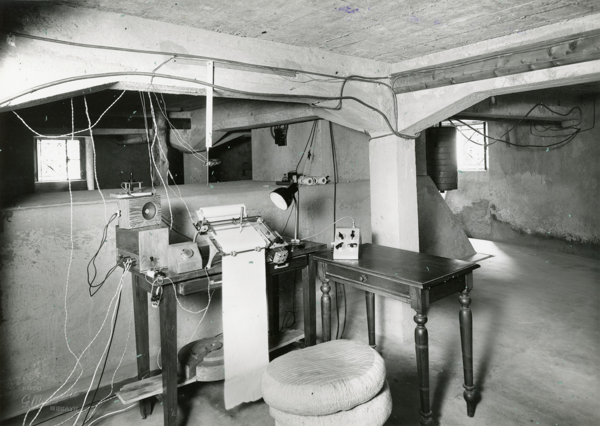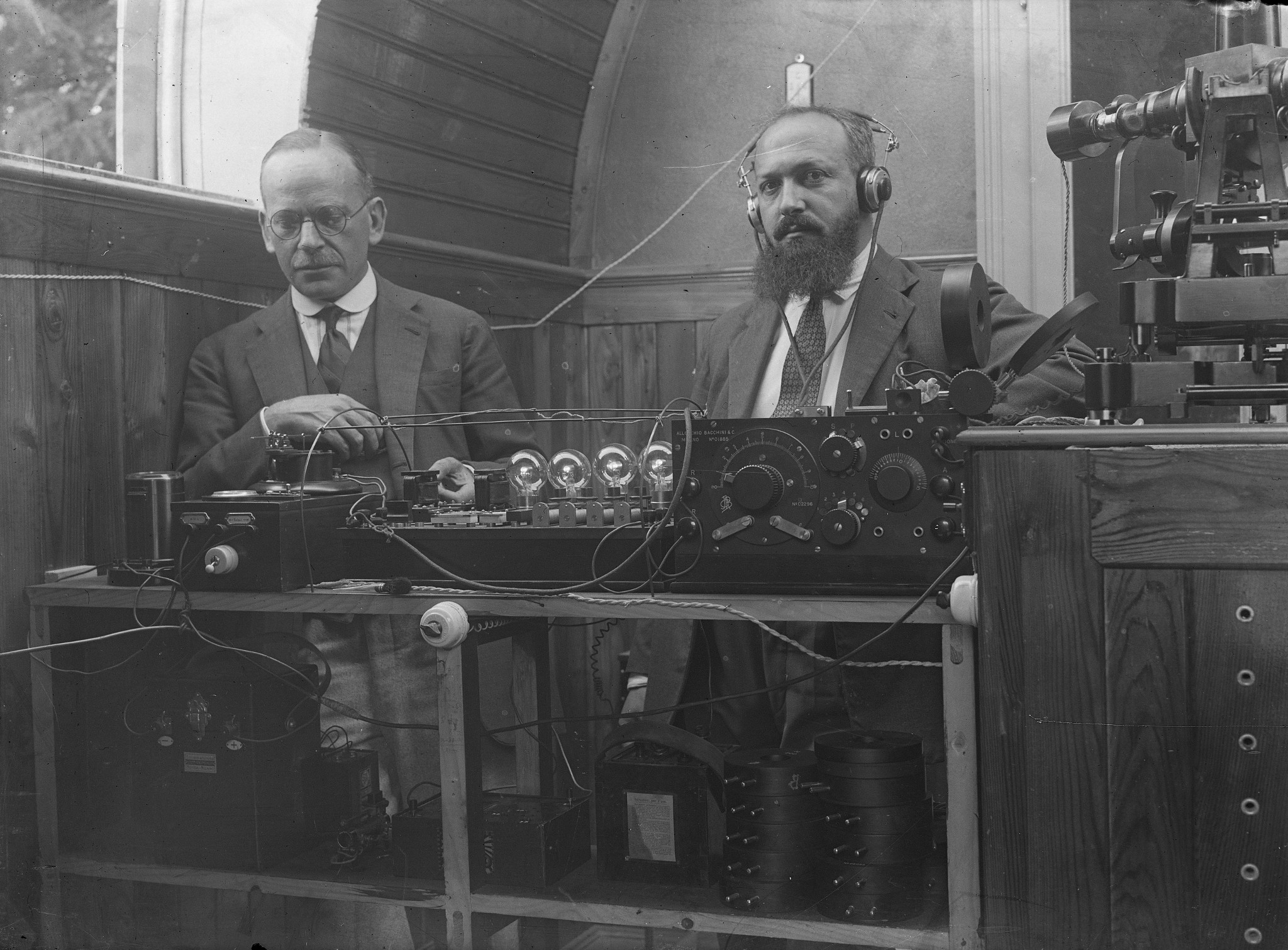 Le apparecchiature usate per una campagna di longitudine a Merate (probabilmente attorno al 1930). Sono visibili: sulla destra, lo strumento dei passaggi Bamberg; sulla sinistra, l'apparecchio radio che serviva per la trasmissione e la ricezione dei segnali per la sincronizzazione degli orologi tra i diversi osservatori che partecipavano alla campagna. La persona a sinistra è Emilio Bianchi, direttore dell'Osservatorio.