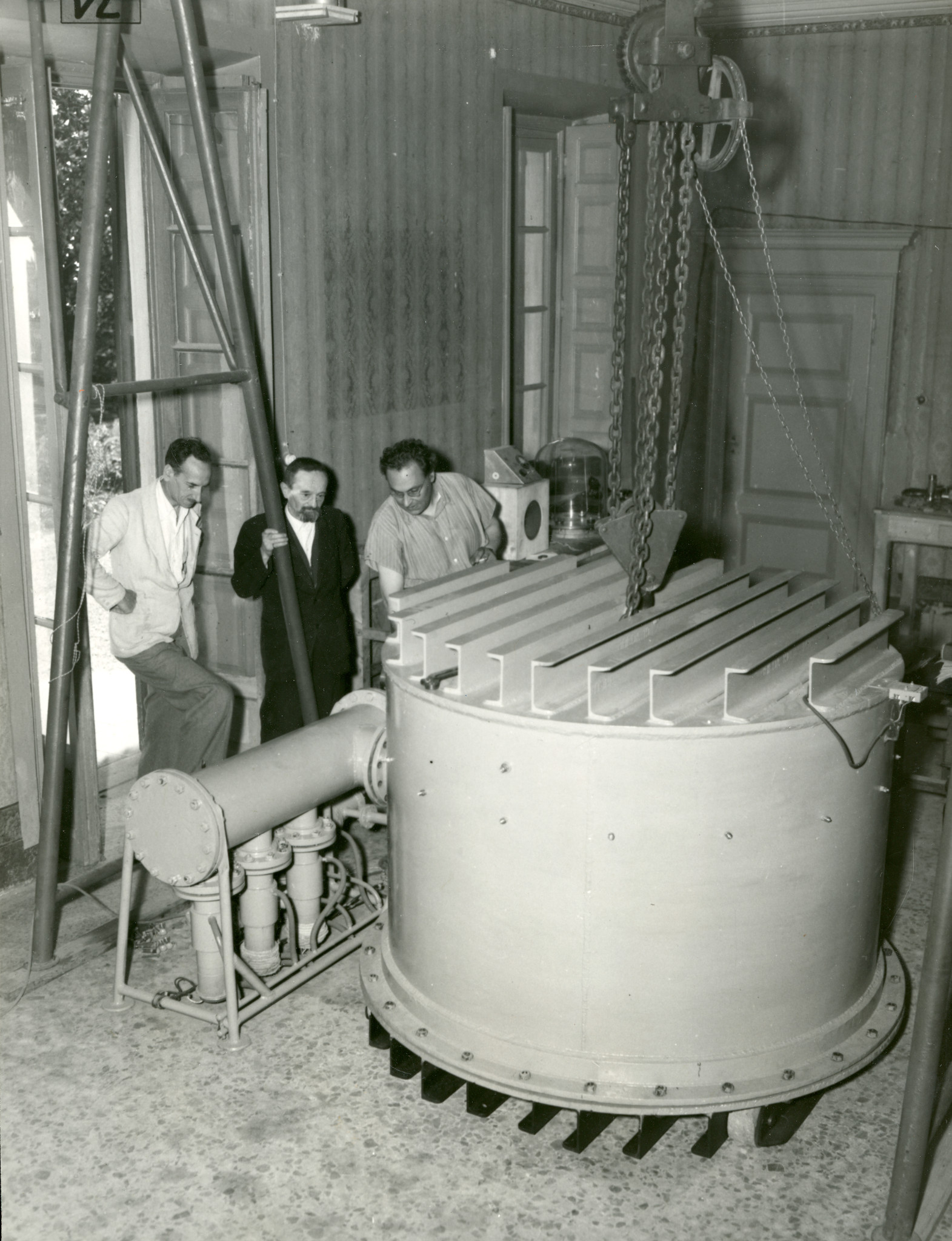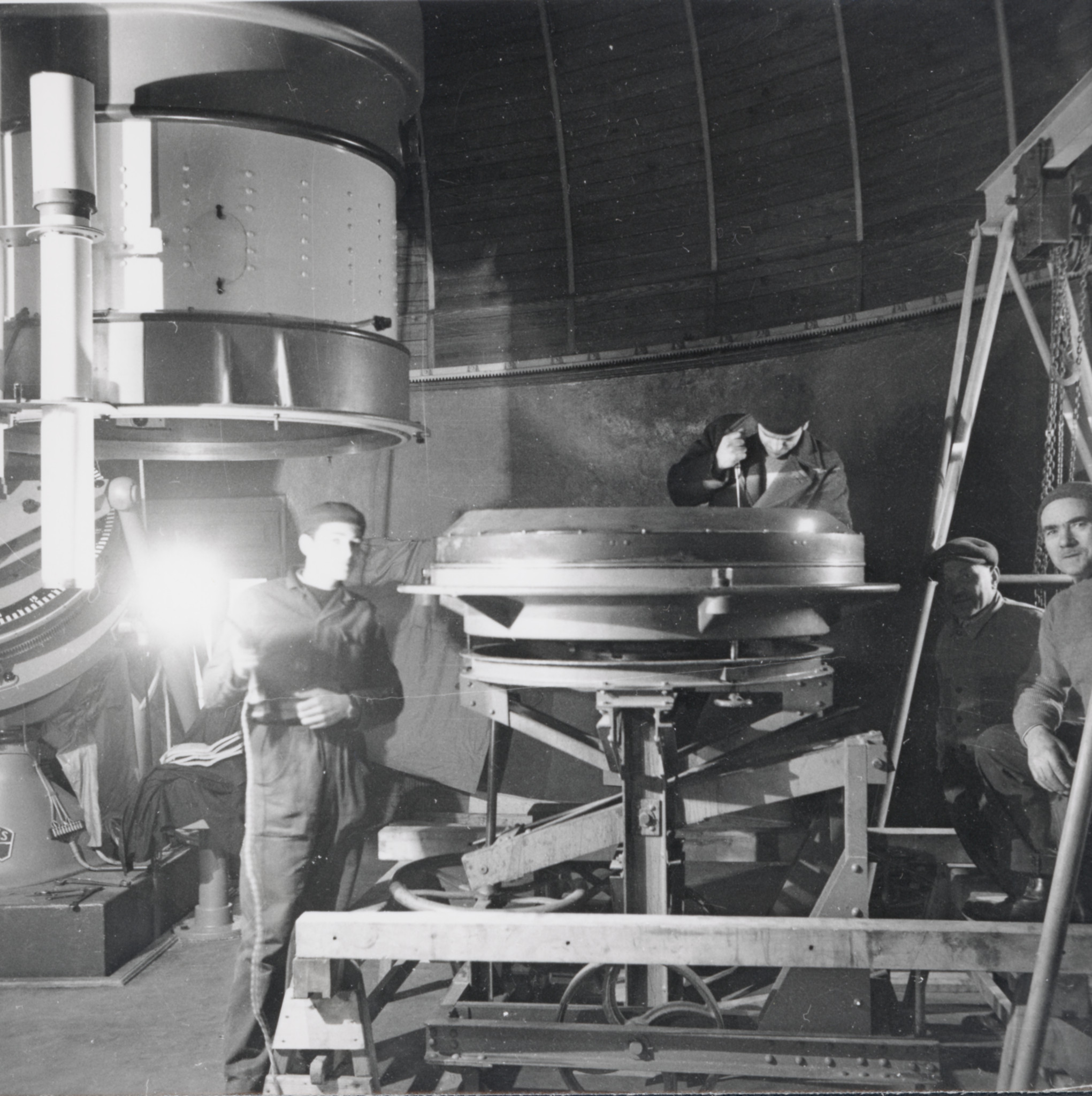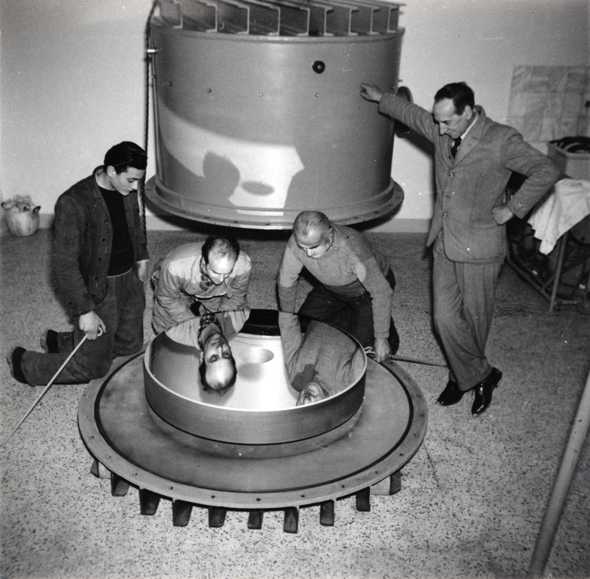 L'obiettivo di un telescopio riflettore viene estratto dalla campana a vuoto al termine del processo di alluminatura. A destra, in piedi, Francesco Zagar.