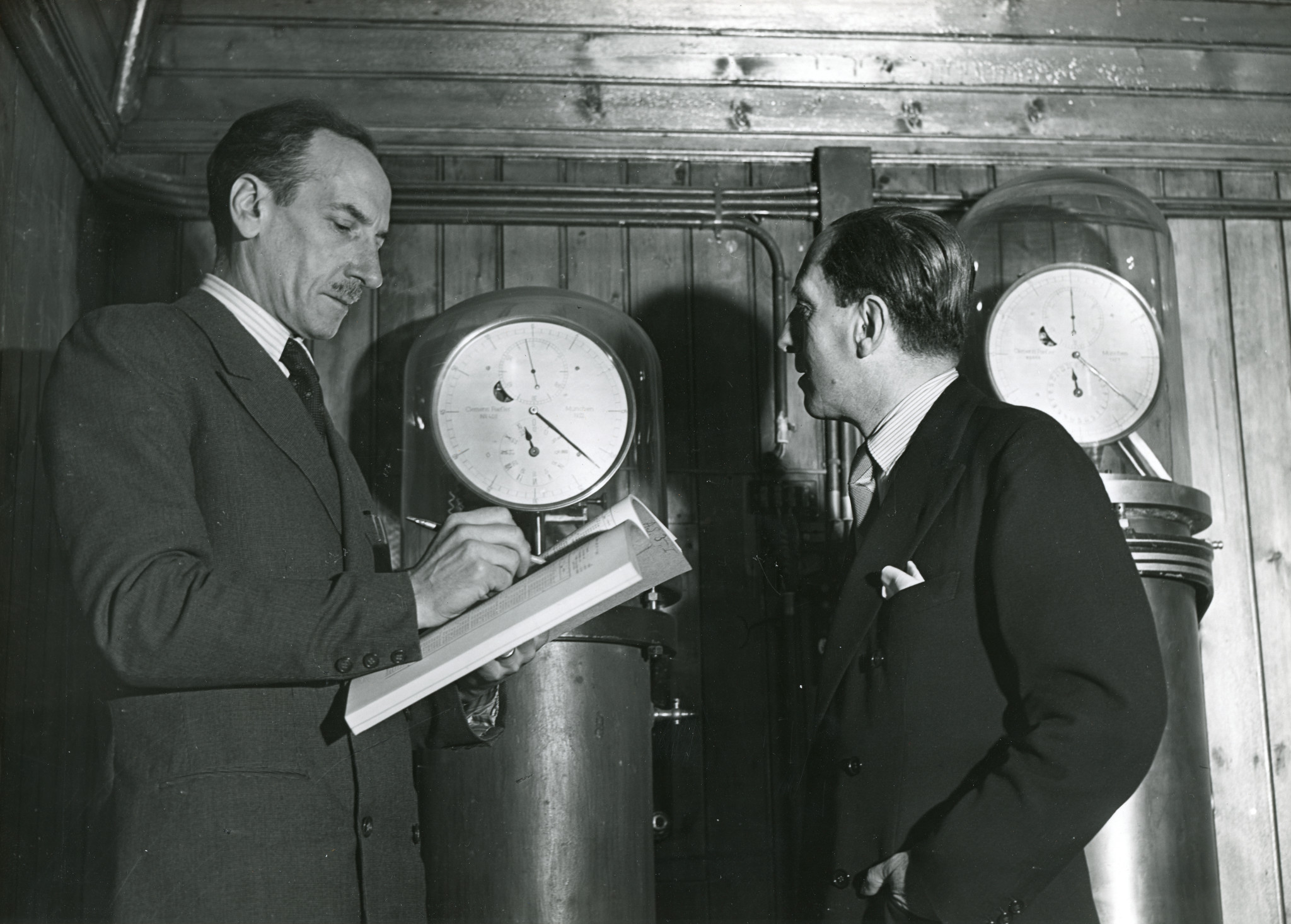 Francesco Zagar (1900-1976), direttore dell'Osservatorio dal 1948 al 1971 (a sinistra) e Alberto Masani davanti a due orologi a pendolo Riefler in un cupolino di Merate.