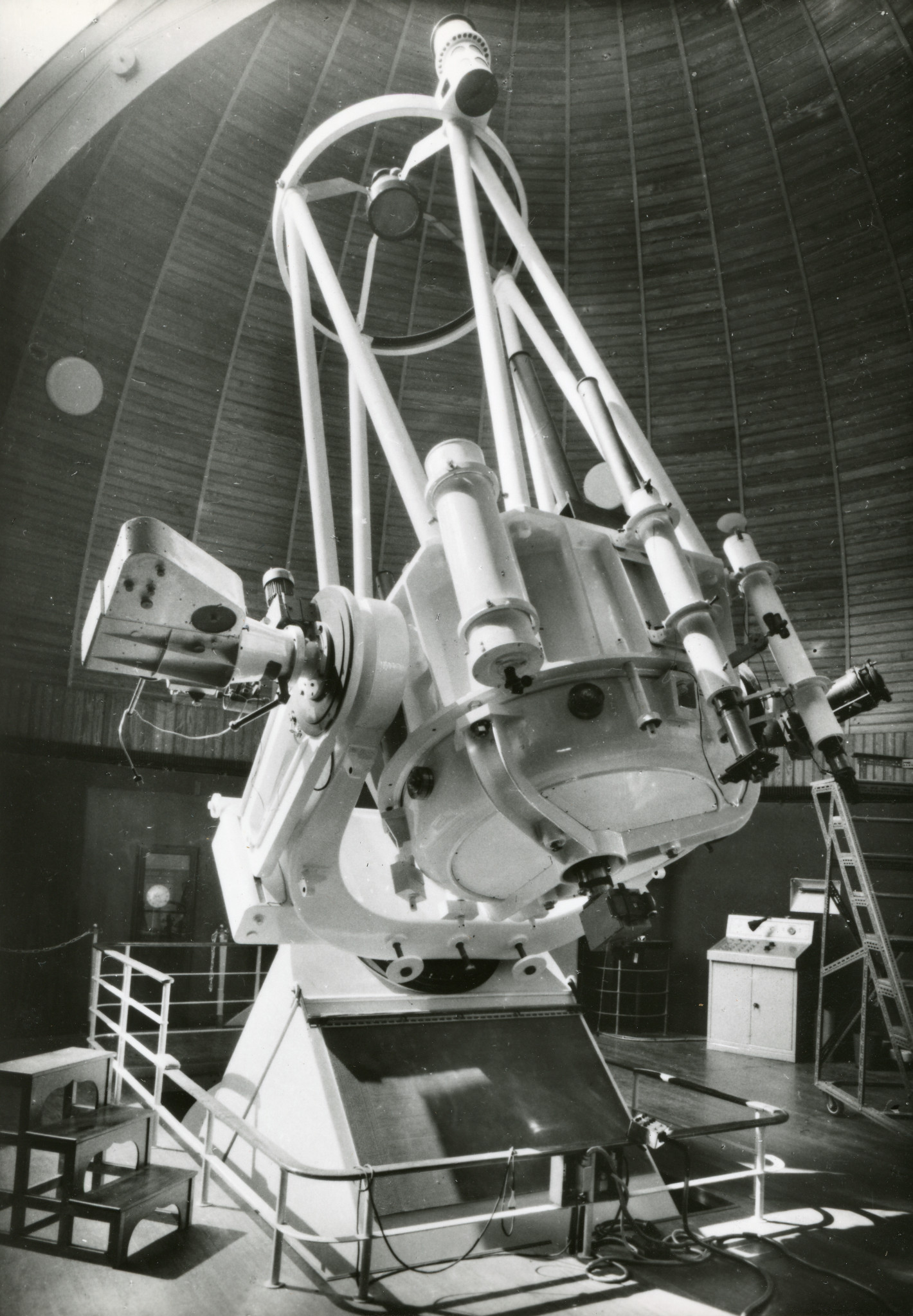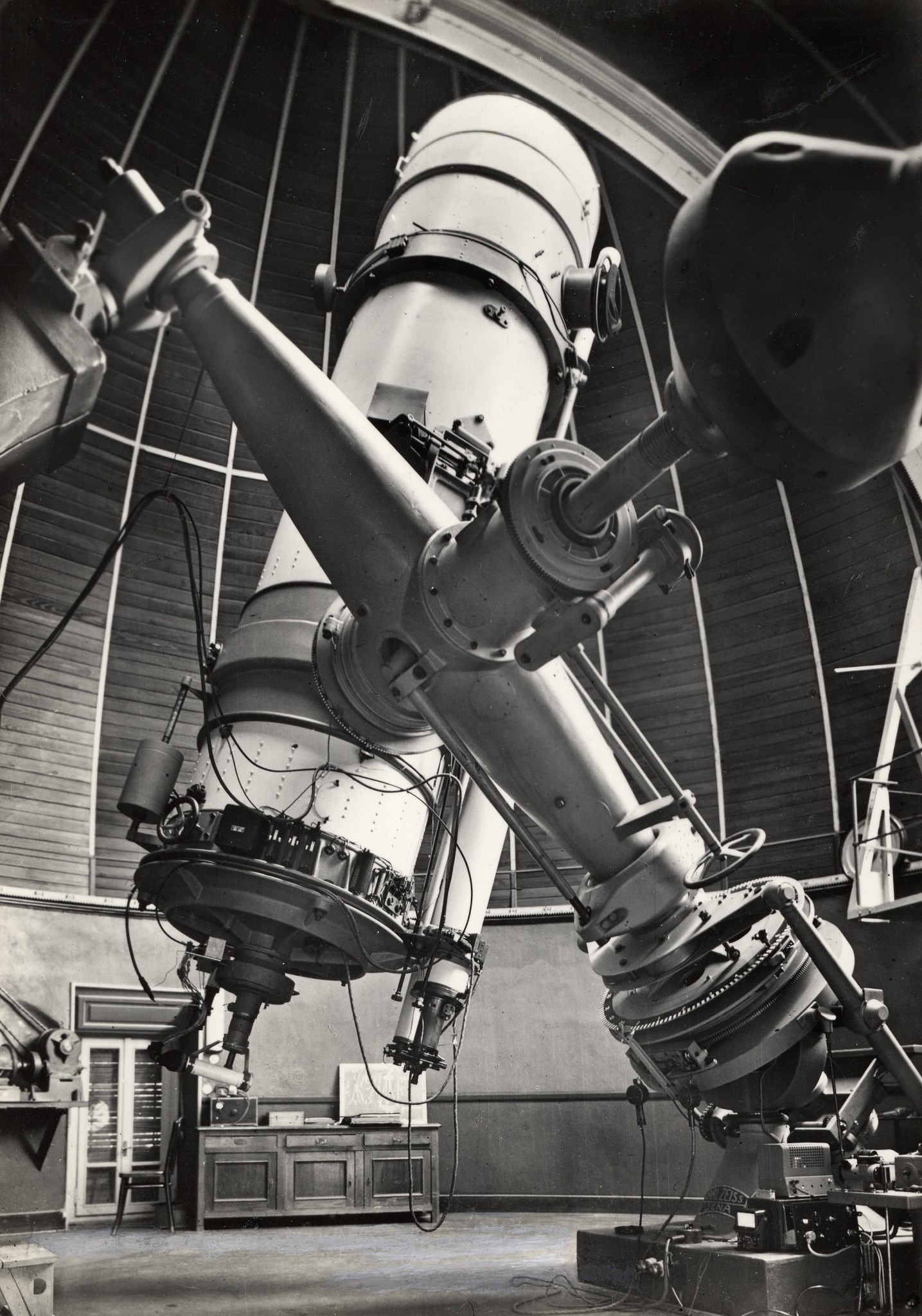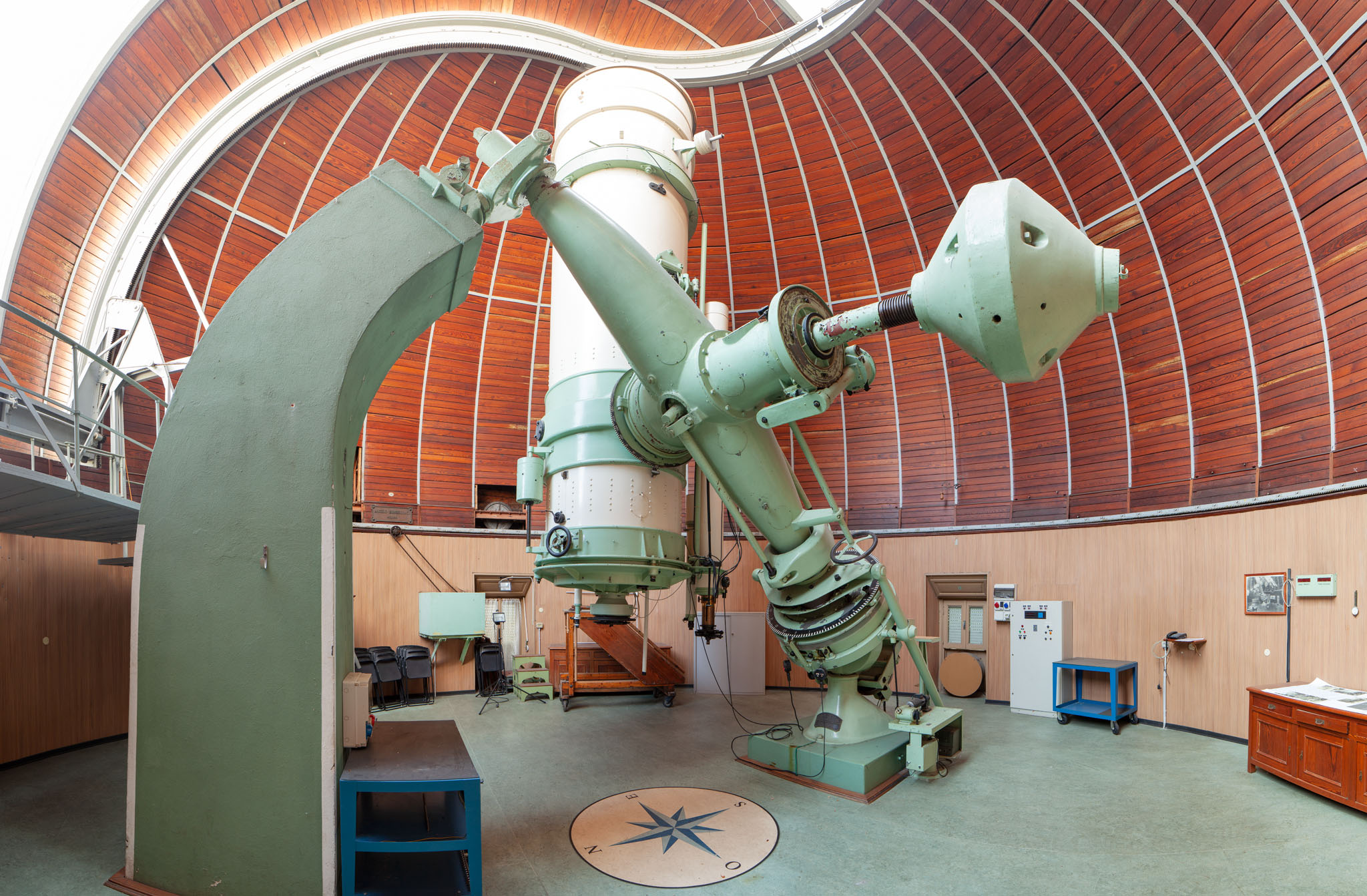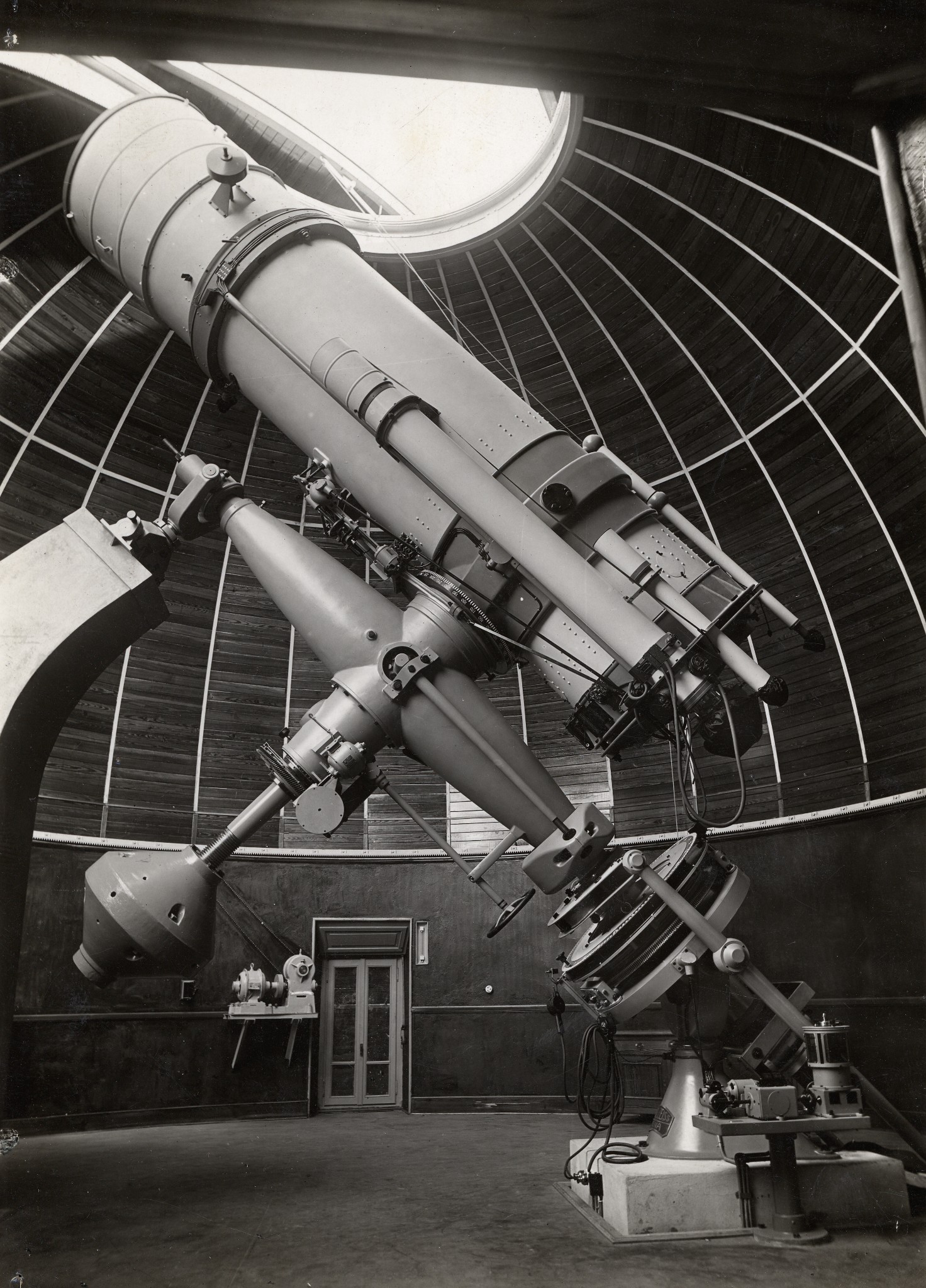 Il rifrattore Merz-Repsold nella sua cupola a Merate. Il telescopio è puntato in direzione quasi orizzontale; di conseguenza il pavimento della cupola è stato sollevato alla sua massima altezza, per permettere all'osservatore di raggiungere agevolmente l'oculare dello strumento.