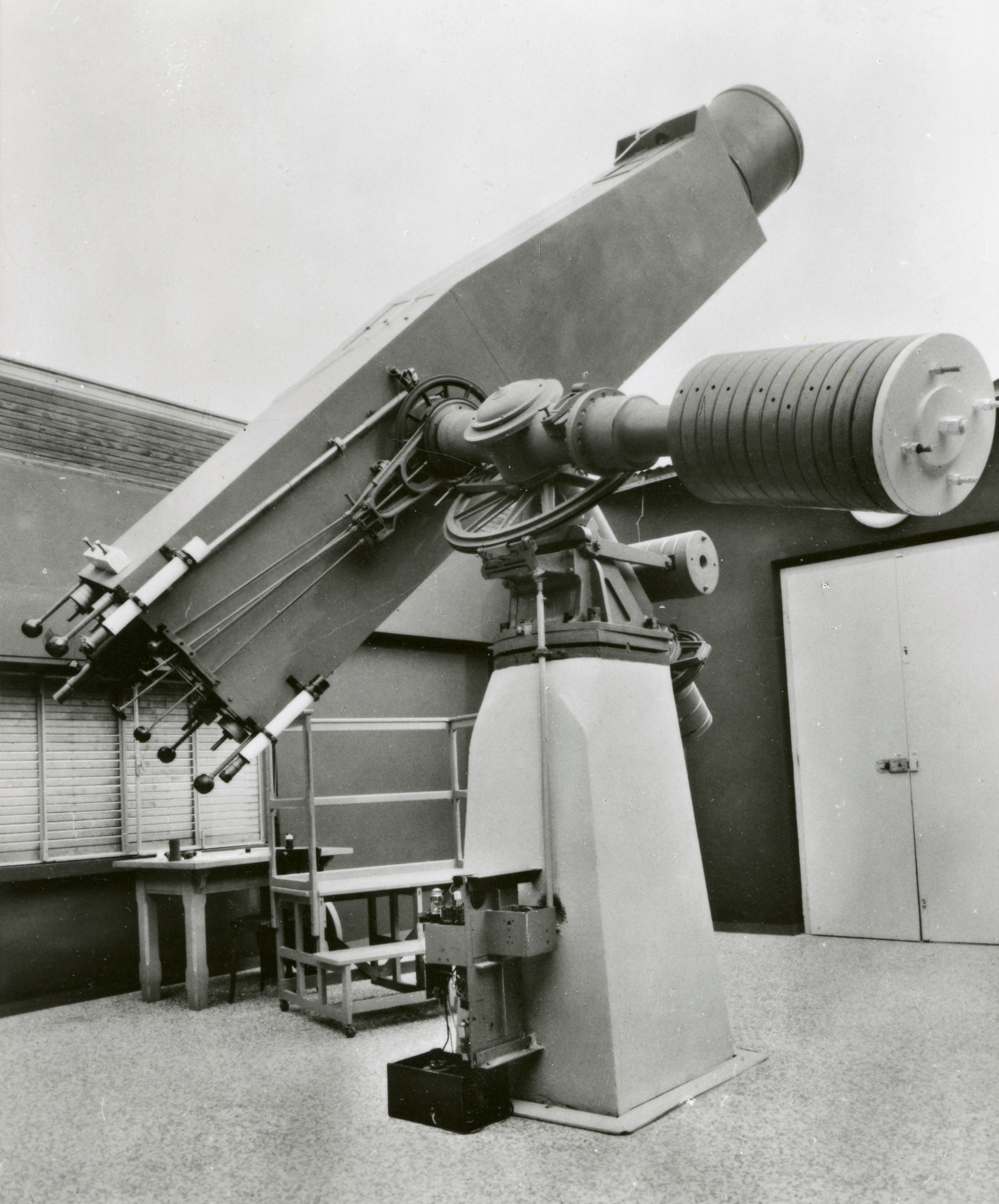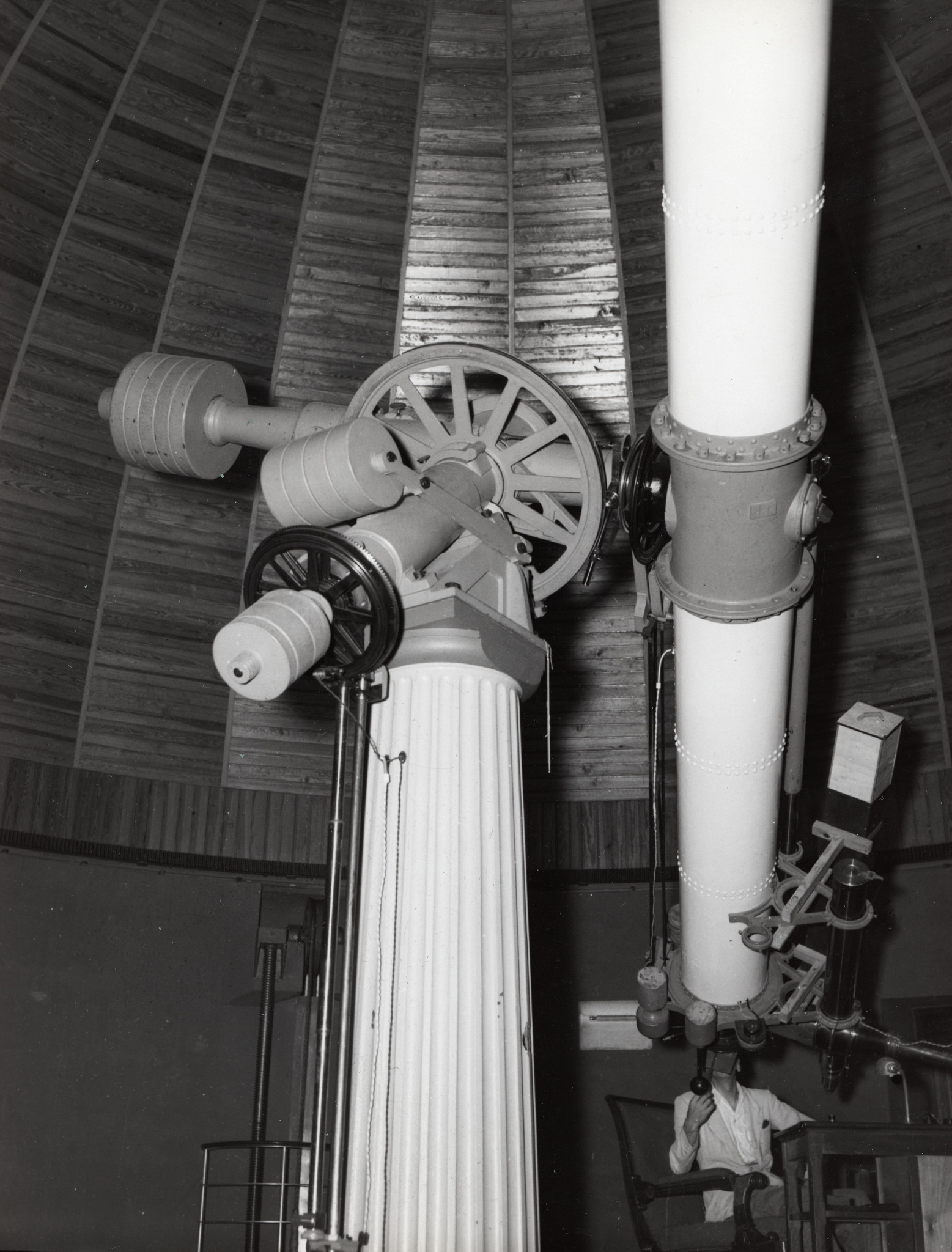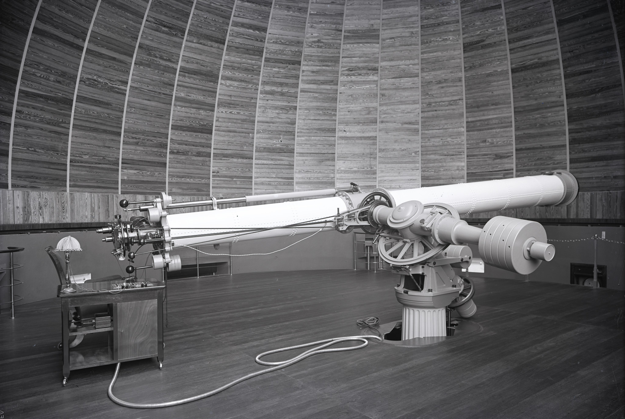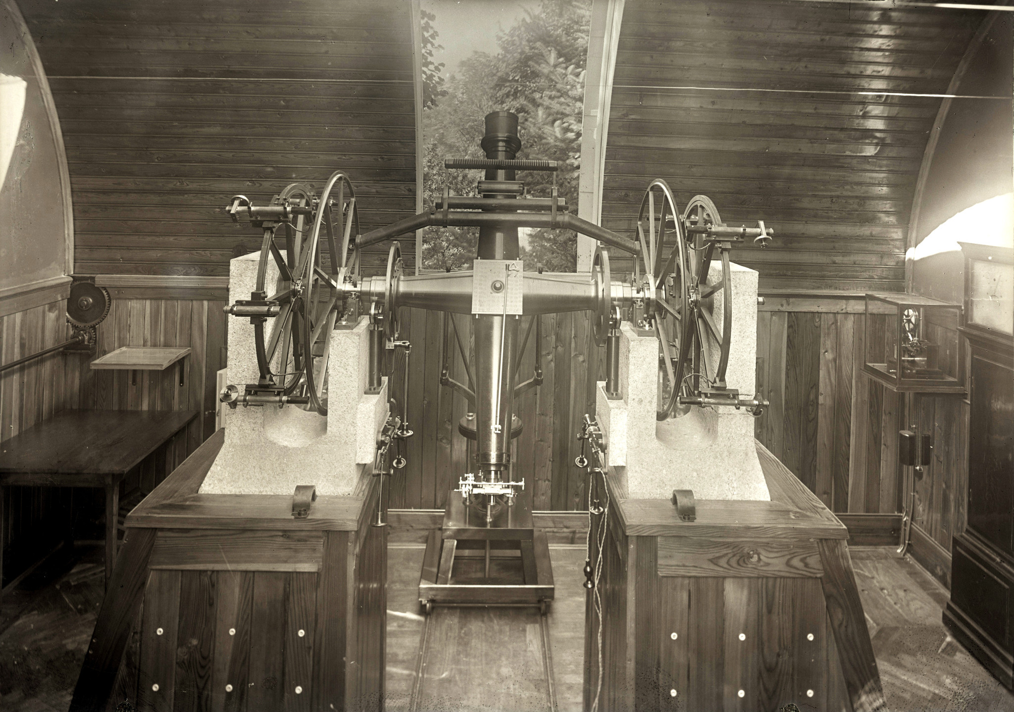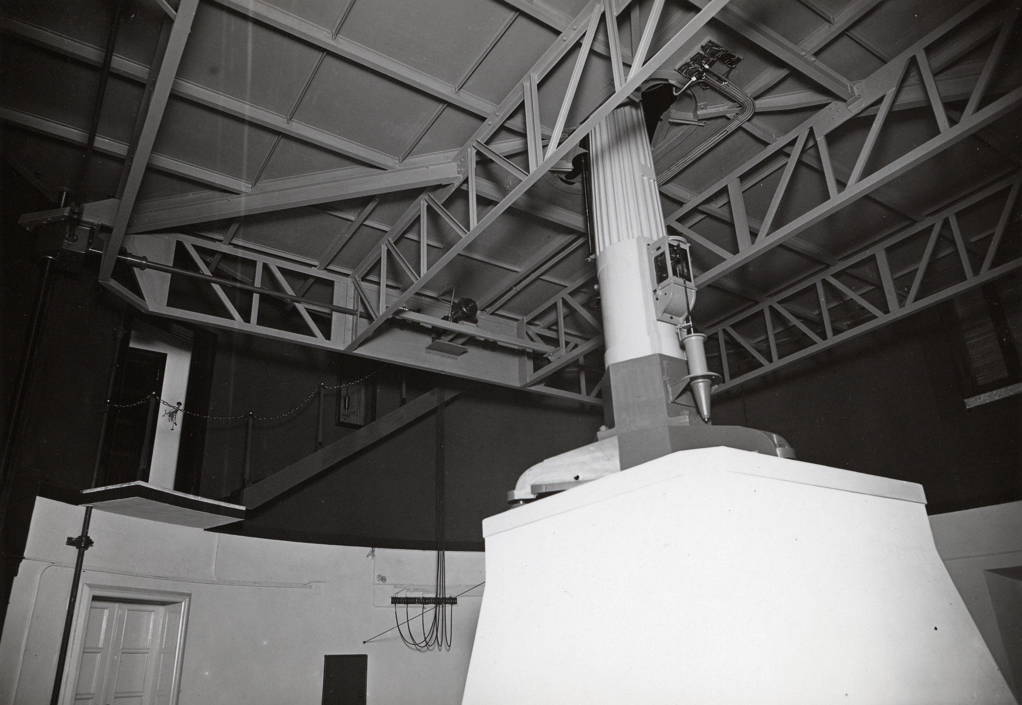 Il rifrattore Merz-Repsold nella sua cupola a Merate. Il telescopio è puntato in direzione quasi orizzontale; di conseguenza il pavimento della cupola è stato sollevato alla sua massima altezza, per permettere all'osservatore di raggiungere agevolmente l'oculare dello strumento.