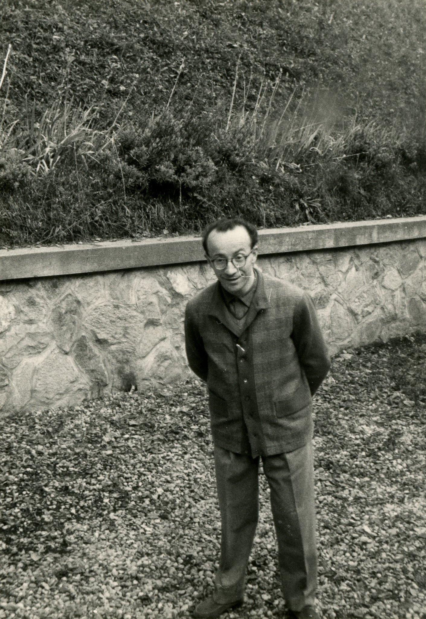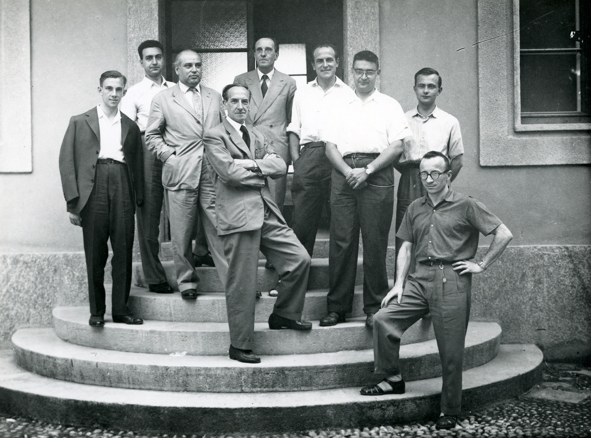 Foto di gruppo davanti all'ingresso del nuovo edificio dell'Osservatorio a Merate (inaugurato nel 1951). Da sinistra a destra: Arrigo Cigna, Edoardo Proverbio, Luigi Santomauro, Francesco Zagar, Cesare Lombardi, Alberto Masani, Aldo Kranjc, Pietro Broglia, Massimo Fracassini.