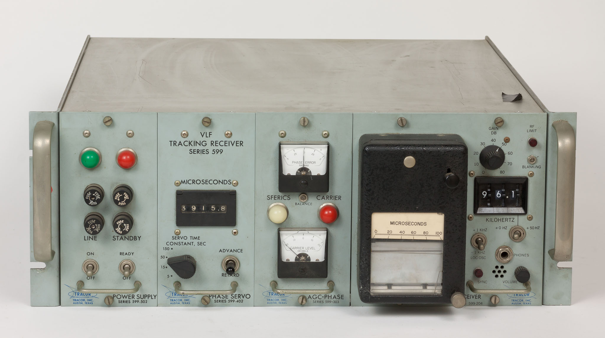 Il VLF tracking receiver Tracor 599J era uno degli strumenti in dotazione al centro di astrometria e determinazione del tempo di Merate: serviva a confrontare i segnali di frequenza ricevuti da una stazione radio con i segnali degli orologi locali. Lo strumento è attualmente conservato in un magazzino della sede di Merate.