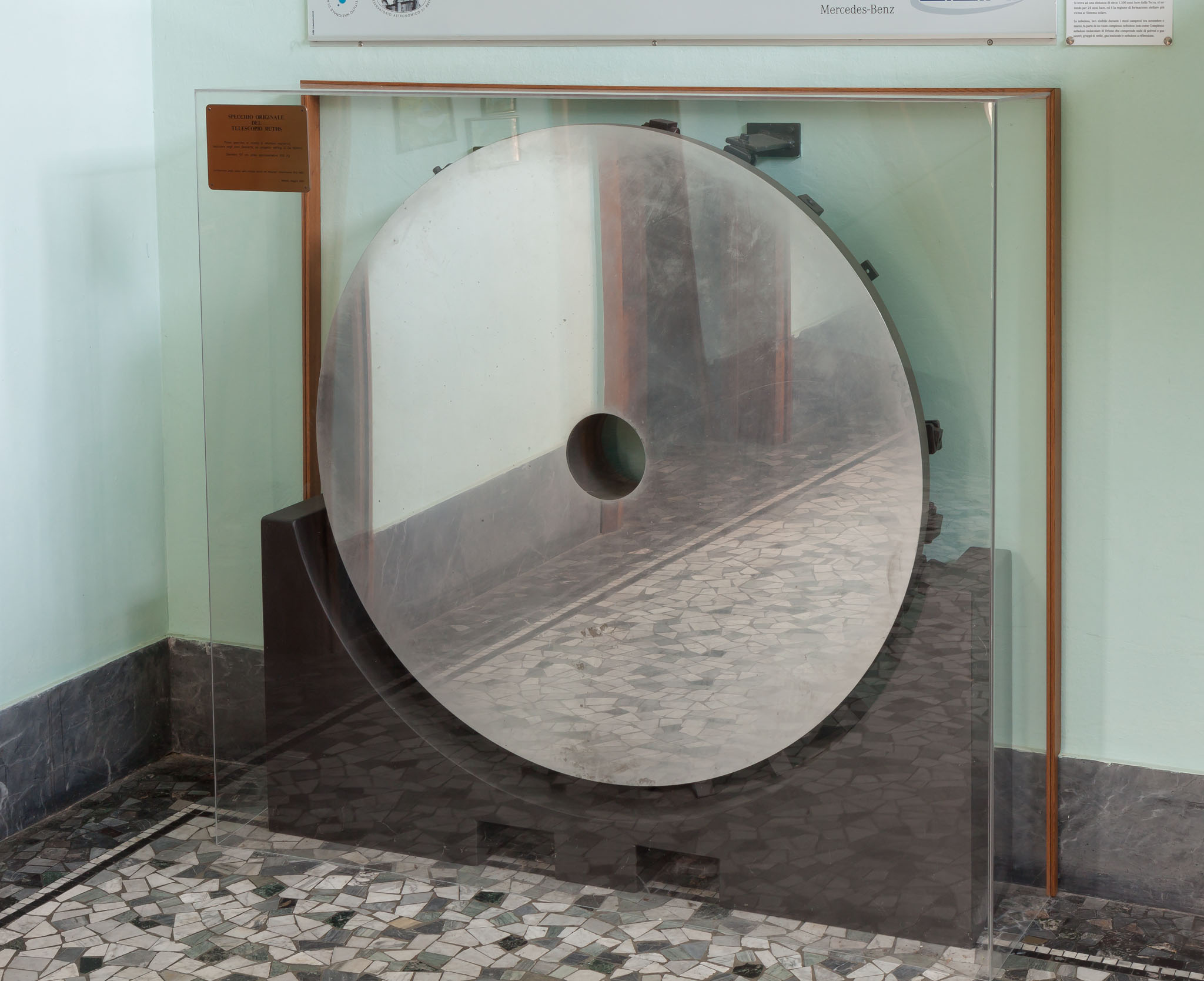 Il pavimento della cupola del rifrattore Merz-Repsold a Merate, visto dal di sotto. Il pavimento del locale di osservazione ha un meccanismo che permette di sollevarlo ad altezze diverse, in modo che l'osservatore abbia un facile accesso all'oculare del telescopio indipendentemente dall'altezza sull'orizzonte a cui il telescopio è puntato.