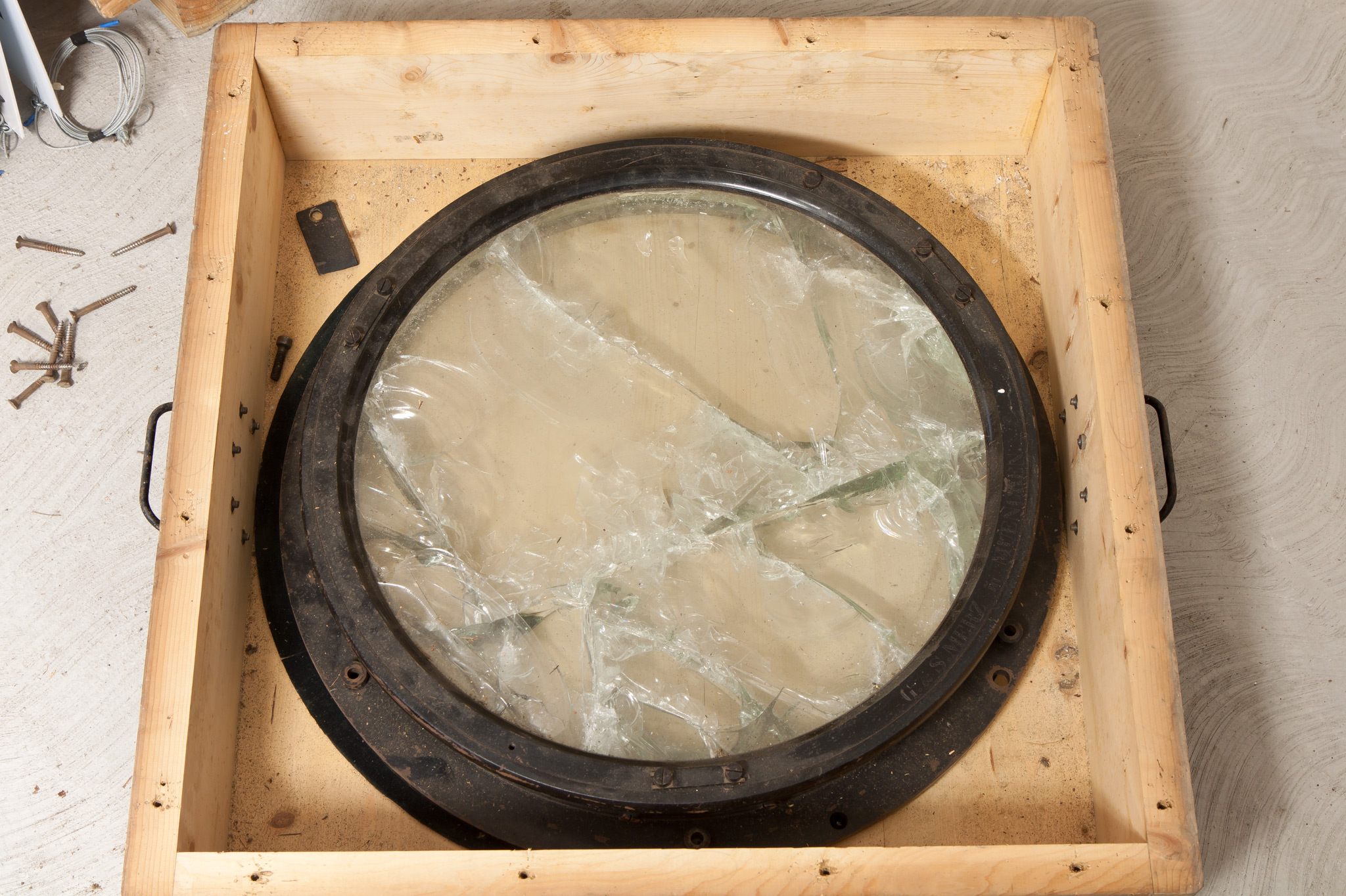 La fotografia mostra le condizioni attuali dell'obiettivo Merz da 49 cm, conservato in un magazzino a Merate.