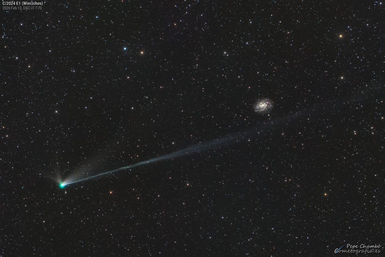 Explanation: Some comets are regular guests of our solar neighborhood; others come by only once, never to return. We won’t have another chance to see Comet C/2024 E1 (Wierzchoś), which is currently making its way through the inner Solar System. The hyperbolic orbit of this comet indicates that it will likely become an interstellar traveler. Comet Wierzchoś is today near its closest approach to the Earth, passing roughly the same distance from the Earth as is the Sun. The featured 30-minute exposure was taken last week in Chile and shows a 5-degree long ion tail as well as three shorter dust tails. The green hue of the coma comes from the breakdown of dicarbon molecules by sunlight, but that process does not last long enough to also tinge the tails. On the far right lies a spiral galaxy far in the distance: NGC 300.