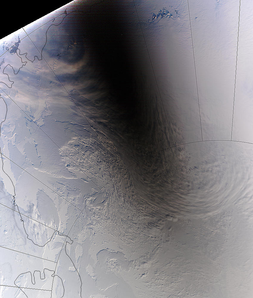 Explanation: The long shadow of the Moon fell across the continent of Antarctica on November 23rd, during the second solar eclipse of 2003. In this view from orbit, based on data from the MODIS instrument on board the Earth observing Aqua satellite, the Moon's shadow stretches for almost 500 kilometers. Recorded between 23:15 and 23:20 Universal Time, the shadow was cast by a lunar disk silhouetted by the Sun hanging only about 15 degrees above the antarctic horizon. Observers within the central dark portion of the oval-shaped shadow could view the totally eclipsed sun. Shadows of mountains and clouds are also visible over the Norwegian named Queen Maud Land, Antarctica with the South Pole just beyond the lower right corner of the image.