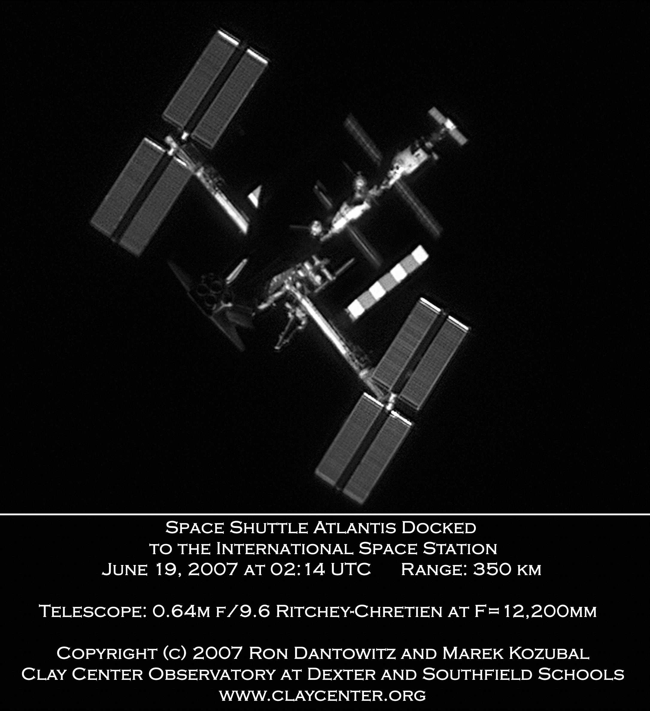 Explanation: This remarkable image of the space shuttle orbiter Atlantis docked with the International Space Station (ISS) was taken at a range of 190 nautical miles. To record the fast moving pair, last week astronomers at Clay Center Observatory, near Boston, Massachusetts, planet Earth, used a satellite tracking system and 25-inch diameter telescope in combination with a digital video camera. In the sharp picture, Atlantis is below and left of center. The aft view shows three main engines just below its vertical tail glinting in the sunlight. With the Sun shining from below, the body of the orbiter casts a long shadow across the ISS itself and impressive details of the ISS solar arrays used for power generation are easily visible. The large set of solar arrays installed at the lower right was delivered during this visit from Atlantis.
