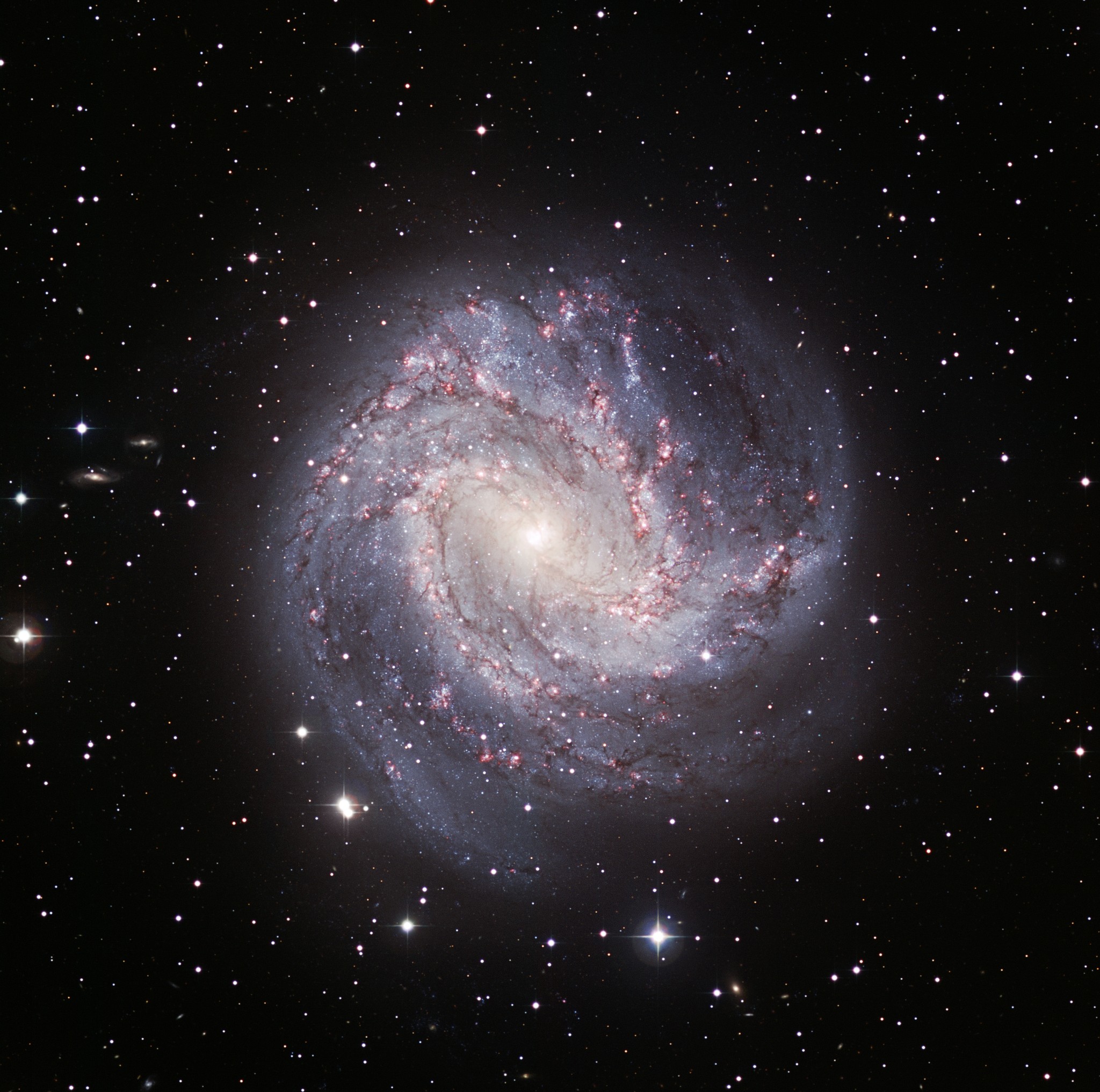 Explanation: Big, bright, and beautiful, spiral galaxy M83 lies a mere twelve million light-years away, near the southeastern tip of the very long constellation Hydra. Prominent spiral arms traced by dark dust lanes and blue star clusters lend this galaxy its popular name of the Southern Pinwheel. But reddish star forming regions that dot the sweeping arms highlighted in this sparkling color composite also suggest another nickname, The Thousand-Ruby Galaxy. About 40,000 light-years across, M83 is a member of a group of galaxies that includes active galaxy Centaurus A. The core of M83 itself is bright at x-ray energies, showing a high concentration of neutron stars and black holes left from an intense burst of star formation. The sharp image, based on archival data from the European Southern Observatory's Wide Field Imager camera, also features spiky foreground Milky Way stars and distant background galaxies.