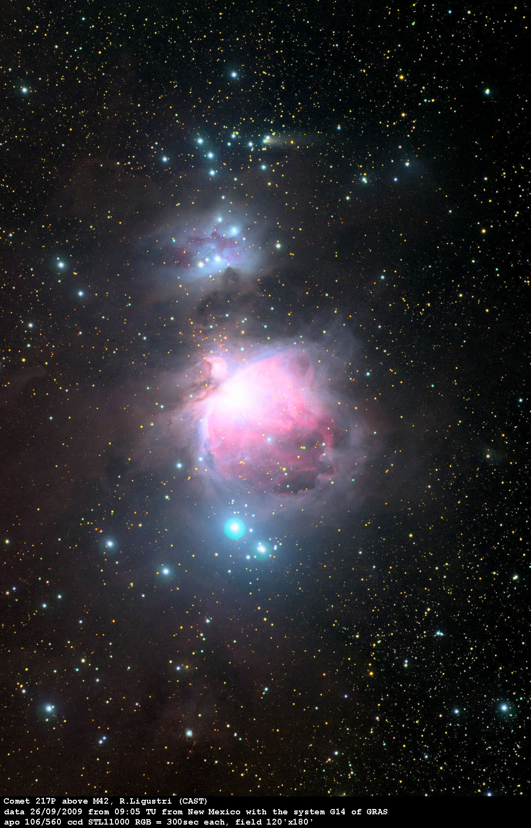 Explanation: These colorful panels both feature a familiar astronomical sight: the stellar nursery known as the Great Orion Nebula. They also offer an intriguing and unfamiliar detail of the nebula rich skyscape -- a passing comet. Recorded this weekend with a remotely operated telescope in New Mexico, the right hand image was taken on September 26 and the left on September 27. Comet 217P Linear sports an extended greenish tail and lies above the bluish Running Man reflection nebula near the top of both frames. Nearby and moving rapidly through the night sky, the comet's position clearly shifts against the cosmic nebulae and background stars from one night to the next. In fact, the comet was a mere 5 light-minutes away on September 27, compared to 1,500 light-years for the Orion Nebula. Much too faint to be seen with the unaided eye, Comet 217P Linear is a small periodic comet with an orbital period of about 8 years. At its most distant point from the Sun, the comet's orbit is calculated to reach beyond the orbit of Jupiter At its closest point to the Sun, the comet still lies just beyond the orbit of planet Earth.