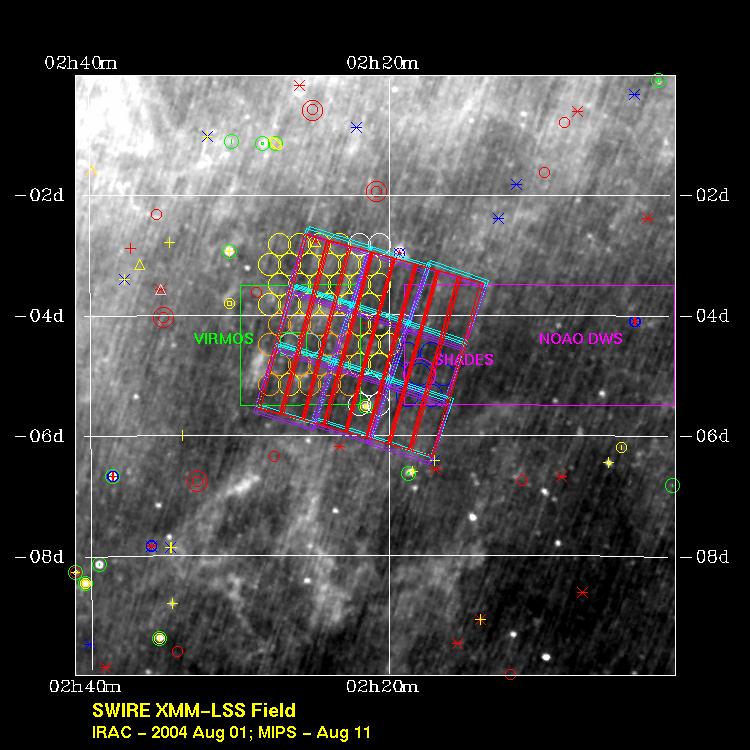 | Optical (CTIO) & SWIRE layout, optical image (2.5 deg x 3.7 deg =9.25 deg2) | ||